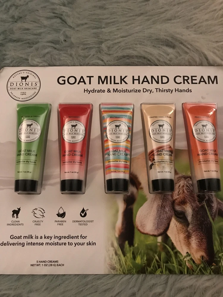 About this item Get Inspired By These Top Fragrances - Get inspired with our five-piece Inspire Goat Milk Hand Cream Gift Set.Featuring top-selling fragrances, this popular set of moisturizing, nutrient-packed goat milk hand creams is perfect for gifting or for yourself. 5 Luxurious Scents - Whether you're in the mood for delightful aurelian lily blossom or the luxuriously fresh rich scent of milky goodness & sweet honey straight from the comb, you'll love every scent in this collection. Great For All Skin Types - Dionis goat milk hand cream products are dermatologist tested, cruelty-free paraben-free, gluten-free, sulfate-free, and made in the USA. For extra sensitive skin, try our unscented options. Feel good about feeling good with Dionis Goat Milk Skincare Products. Responsibly Sourced - Our goat milk is sourced from privately-owned family farms in the United States. These dairy goats are fed a balanced, vegetarian diet, which is full of nutrients, and free of antibiotics, hormones, animal by-products, and preservatives.