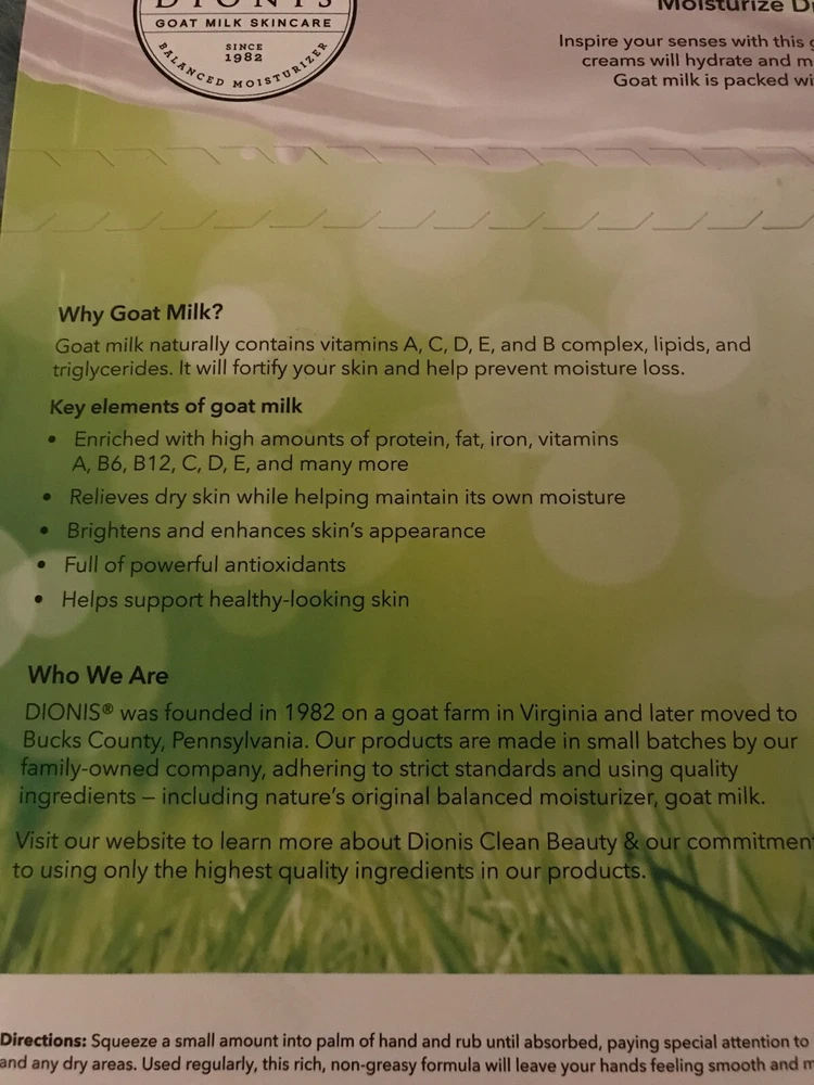 Features: All Natural Ingredients, Alcohol-Free, Animal Cruelty-Free, Paraben-Free Ingredients: Water, Glycerin, Honey Product Line: benefit Total Moisture Body Area: Arm, Full Body, Hand, Feet, Leg Color: Multicolor Skin Type: All Skin Types Active Ingredients: Goat Milk, LAVENDER BLOSSOM, MILK AND HONEY, VANILLA BEAN, Blood Orange Size: Travel Size Brand: Dionis Volume: 1 fl oz Type: Daily Use Formulation: Lotion, Cream Main Purpose: Moisturizer