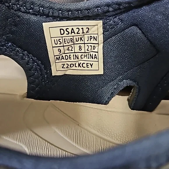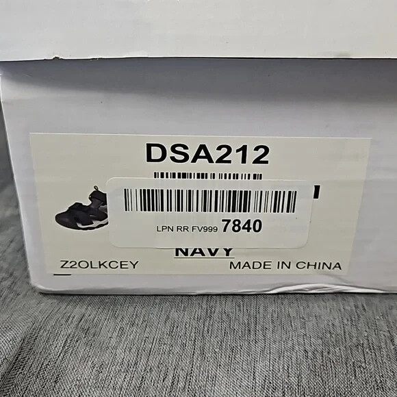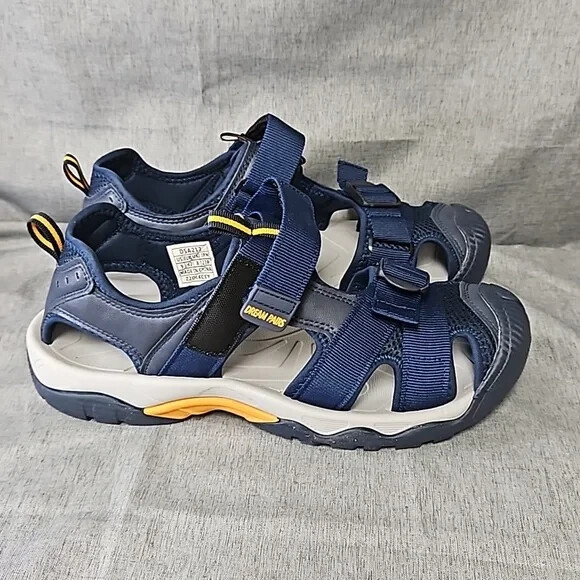 This is a new pair of Dream Pairs men's sport outdoor sandals in navy, size 9. They feature a hook & loop closure, a flat heel, and a fisherman style. These lightweight and comfortable sandals are suitable for summer activities and are made with synthetic materials. The design includes accents of hook & loop and buckle details, with a solid blue color. Perfect for hiking or water sports, these sandals are part of the Dream Pairs product line. Shoes are new in box and never worn. Box has defect on top, but it did not affect the product.