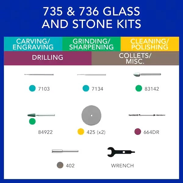 Make the most of your Dremel rotary tools by using our innovative and extensive line of rotary accessories and attachments. Whatever your project, we've got the perfect solution for you. Dremel accessories fit inside your rotary tool to extend it's versatility. Whether you're looking to carve, engrave, cut, sand or grind, there is a Dremel accessory to get the job done with pinpoint precision. That's why our purpose-built Dremel accessories let you get your project right down to the last detail. Dremel accessories are also color-coded into usage categories to make it easier for you to select the right accessory for your project. This 31-piece accessory micro kit is specially curated to perform all sanding and grinding applications. It provides the organized storage of popular Dremel accessories in a small, compact footprint. This accessory set offers a reusable storage case with clear lid and lift-out tray for easy organization of the included bits. The kit consists of aluminum oxide grinding stones, silicon carbide grinding stones, fiberglass reinforced cut-off wheel, sanding discs, sanding drum, sanding bands, EZ Lock finishing abrasive buff and mandrel. Compatible with all Dremel corded and cordless rotary tools. There's no need to hunt for the right collet, all Dremel rotary accessories feature a 1/8 in. standard shank. Specially glass and stone kit for all applications Comes with re-useable storage case and 9 accessories Clear lid, storage bin and removable tray make accessories easy to locate Can stack easily, stand upright or hang on a wall by hook Small footprint saves space Dimensions Product Depth (in.) 4 in Product Height (in.) 6 in Product Length (in.) 4 in Product Width (in.) 2 in Details Application Type Cleaning, Drilling, Engraving, Grinding, Polishing Individual/Set Set Number of Pieces 8 Rotary Tool Accessory Type Assorted Product Set or Kit Set Rotary Types Included Assorted Product Set or Kit Tools Product Type Other