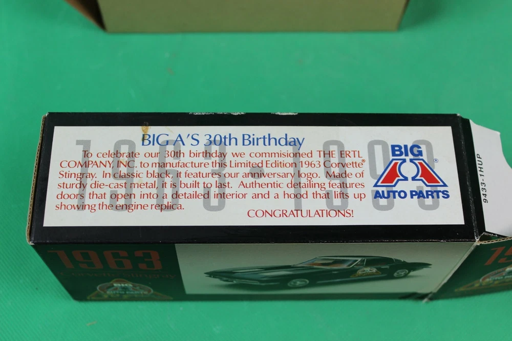 NEW ERTL BIG A AUTO PARTS 1963 Chevrolet Corvette DIECAST 1:24 SCALE 30 YEARS BLACK NEW IN BOX BOX MAY SHOW SHELF WEAR, PLEASE LOOK AT ALL PHOTOS PLEASE LOOK AT ALL THE PHOTOS FOR CONDITION, IT IS YOUR RESPONSIBILITY TO ASK QUESTIONS AND LOOK AT THE PHYSICAL CONDITION THIS IS SOLD AND COMES AS-IS FAST FREE SHIPPING PLEASE CONTACT ME WITH ANY QUESTIONS