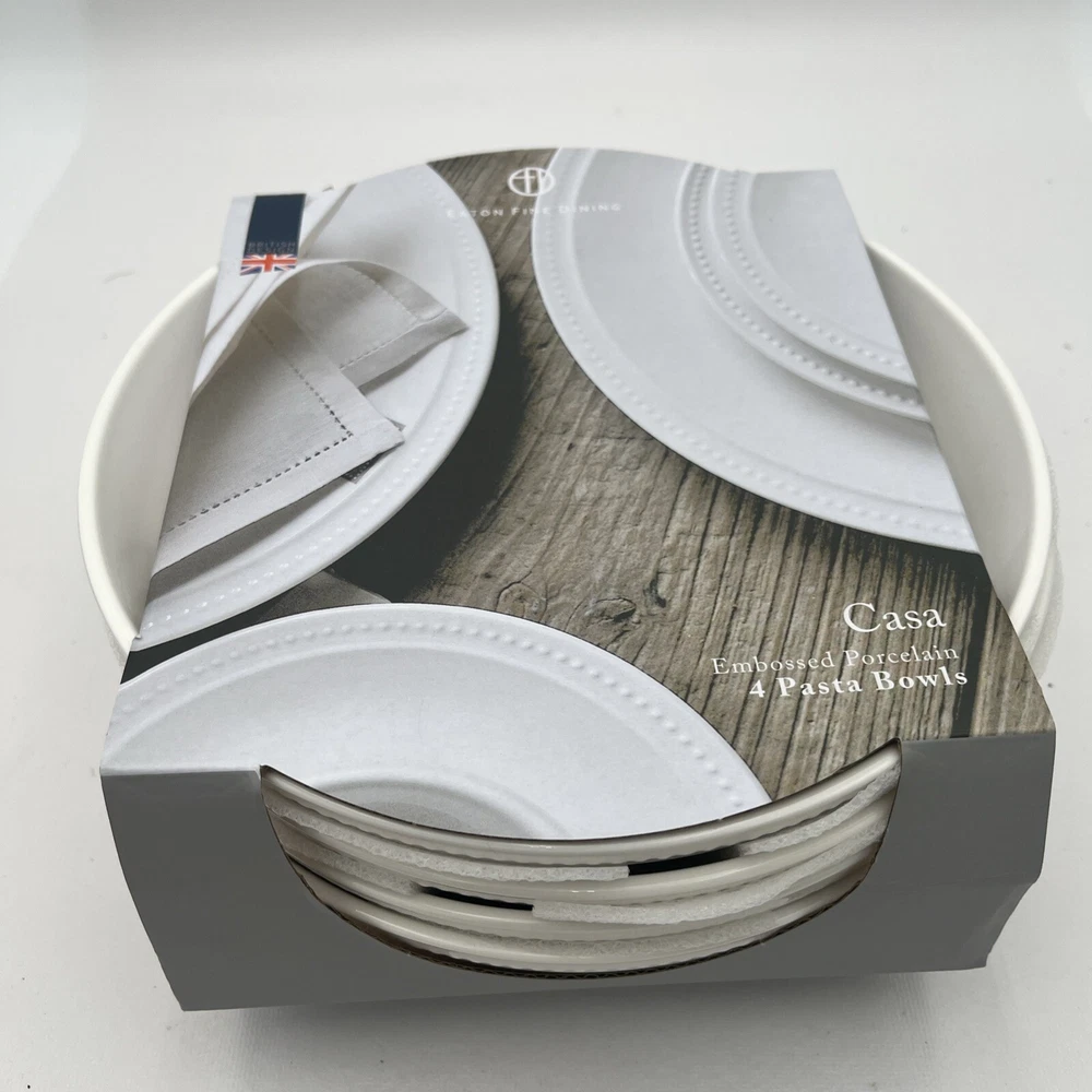 Elevate your dining experience with the Eaton Fine Dining CASA 9” Pasta Bowls, a perfect blend of form and function for any culinary creation. Crafted from high-quality porcelain, these bowls boast a pristine white finish with a distinctive embossed dot edge pattern that adds a touch of elegance to your table setting. Designed in a contemporary style to complement any decor, this set of four is versatile enough for all occasions, be it a casual family dinner or a chic gathering with friends. The bowls are made in China, adhering to the Casa product line's reputation for impeccable craftsmanship and art pottery techniques. Whether you're serving up a hearty pasta dish or a savory soup, these bowls are sure to impress.