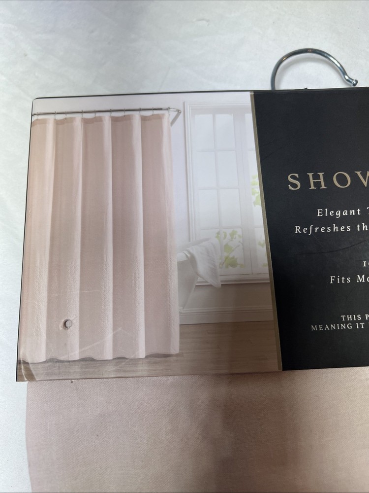 Pink Textured Fabric Shower Curtain with Hooks, Machine Washable, Bathroom