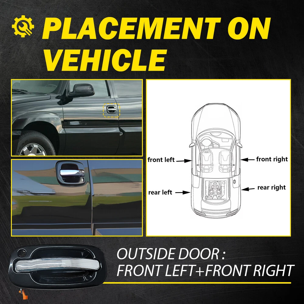Fit for: 2003-2006 Cadillac Escalade 2003-2006 Cadillac Escalade ESV 2002-2006 Cadillac Escalade EXT 2002-2006 Chevrolet Avalanche 1500 2002-2006 Chevrolet Avalanche 2500 1999-2006 Chevrolet Silverado 1500 2007 Chevrolet Silverado 1500 Classic 2001-2006 Chevrolet Silverado 2500 2007 Chevrolet Silverado 2500 Classic 2001-2006 Chevrolet Silverado 3500 2007 Chevrolet Silverado 3500 Classic 2000-2006 Chevrolet Suburban 1500 2000-2006 Chevrolet Suburban 2500 2000-2006 Chevrolet Tahoe 1999-2006 GMC Sierra 1500 2007 GMC Sierra 1500 Classic 2001-2006 GMC Sierra 2500 2007 GMC Sierra 2500 Classic NEW Front Outside Door Handles Set Chrome No Keyhole for 99-06 Silverado Sierra Fit for: 2003-2006 Cadillac Escalade 2003-2006 Cadillac Escalade ESV 2002-2006 Cadillac Escalade EXT 2002-2006 Chevrolet Avalanche 1500 2002-2006 Chevrolet Avalanche 2500 1999-2006 Chevrolet Silverado 1500 2007 Chevrolet Silverado 1500 Classic 2001-2006 Chevrolet Silverado 2500 2007 Chevrolet Silverado 2500 Classic 2001-2006 Chevrolet Silverado 3500 2007 Chevrolet Silverado 3500 Classic 2000-2006 Chevrolet Suburban 1500 2000-2006 Chevrolet Suburban 2500 2000-2006 Chevrolet Tahoe 1999-2006 GMC Sierra 1500 2007 GMC Sierra 1500 Classic 2001-2006 GMC Sierra 2500 2007 GMC Sierra 2500 Classic 2001-2006 GMC Sierra 3500 2007 GMC Sierra 3500 Classic 2000-2006 GMC Yukon 2000-2006 GMC Yukon XL 1500 2000-2006 GMC Yukon XL 2500 Specifications: OE Number: 15182419, 15745149 GM1310187, GM1311153 Product Material: ABS Color: Black+chrome (as pictures show) Placement on Vehicle: Front left and front right of outside door With Keyhole: Front driver side Without Keyhole: Front passenger side Features: *Perfect Fitment Comply with the industrial standards, use it with confidence. *Strict Quality Control All of our handles undergo strict quality control not just before shipping but throughout the production process. *Durable Material Mainly made of high-quality material to ensure the long service life and durability. *Simple Installation Easy installation with direct replacement, other modifications are not required. *Warm Notice Please double-check the part number and models in the description to guarantee it fits your vehicle before ordering. Packaging Include: Door handle*2 Item Specifics Brand Unbranded Package Include Door Handle *2 Type Door Handle Manufacturer Warranty 1 Year Fitment Type Direct Replacement Features Easy Installation, Perfect fit, Strict Quality Control,Durable Other Part Number OUTER EXTERIOR OUTSIDE DOOR HANDLE Interchange Part Number 15182419, 15745149 GM1310187, GM1311153 OE/OEM Part Number 15182419, 15745149 GM1310187, GM1311153 Placement on Vehicle Front left and front right of outside door Material ABS Color Black,chrome Fit for 1 Fit for 2003-2006 Cadillac Escalade Fit for 2 Fit for 2003-2006 Cadillac Escalade ESV Fit for 3 Fit for 2002-2006 Cadillac Escalade EXT Fit for 4 Fit for 2002-2006 Chevrolet Avalanche 1500 2500 Fit for 5 Fit for 1999-2006 Chevrolet Silverado 1500 Fit for 6 Fit for 2007 Chevrolet Silverado 1500 2500 3500 Classic Fit for 7 Fit for 2001-2006 Chevrolet Silverado 2500 3500 Fit for 8 Fit for 2000-2006 Chevrolet Suburban 1500 2500 Fit for 9 Fit for 2000-2006 Chevrolet Tahoe Fit for 10 Fit for 1999-2006 GMC Sierra 1500 Fit for 11 Fit for 2007 GMC Sierra 1500 2500 3500 Classic Fit for 12 Fit for 2001-2006 GMC Sierra 2500 3500 Fit for 13 Fit for 2000-2006 GMC Yukon Fit for 14 Fit for 2000-2006 GMC Yukon XL 1500 2500 With Keyhole Front driver side Without Keyhole Front passenger side FAQ ♥ If you have a decoding problem or any other problems, please contact us first, we will help you with it. We will reply you within 24 hours in working days. I'm a new seller, thanks a lot for your trust and convince! I will serve you with all my heart. ♥ Q1: Will this bulb fit my vehicle? A: We can match almost any vehicle to one of our bulb sizes. eBay only lets us include some vehicle fitments per listing, but if your vehicle does not show up on the compatibility table at the top of our listings, welcome you to contact us for free consulation before purchasing a product. Q2: My item has not arrived, what's taking so long? A: Sometimes items take longer than expected, especially if it’s going far or to rural area. Check with your post office to see if your item has been held up. Sometimes Royal Mail will not update a tracking number until it has arrived at its destination. If your item still don't arrive after a few days, let us know so we can double check for you and help solve it asap. Q3: My bulbs won't fit, help! A: Special bulb holder may be required. See if you can take the holder from the stock bulb. If not, let us know. The bulb size may be wrong, double check the item you received with the item you ordered. Do you have an aftermarket lighting housing? These may not be perfectly fitted for aftermarket bulbs and will require some manual modifications. Q4: Neither side lighting up? Both sides flicker, hyper flash, or work inconsistantly. A:Check the light fuses, and then check the ballast plugs to insure correct installation. If this doesn't work, there may be a voltage problem with the vehicle. You probably just need a relay or capacitor. Even though some bulbs are builtin resistors, they may still need a decoder. Pay & Ship (1). We gladly accepts payment via PayPal, We will ship your item(s) within 24 hours. (2). Before payment, please keep the consistency of Paypal address and ebay address. (3). Quantity orders are welcome! Returns (1). We offer 60 days free return policy. Please contact us within 60 days from the date you receive your order if you have any issues with the product or want return. Refund will be send after we got your resend package. (2). All returned items should be in the original packaging , return tracking information should be provided . Contact Us (1).Negative feedback will not help resolve any problems you have, please contact us via eBay messages before leaving negative feedbac