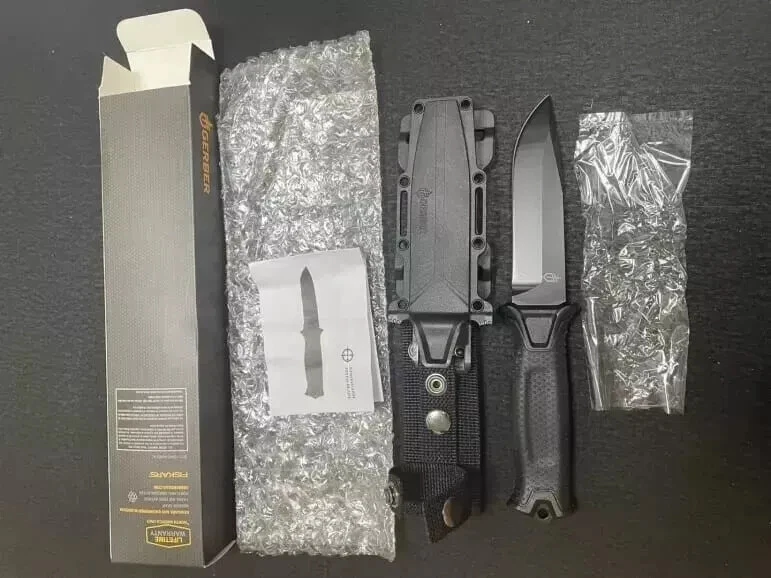 About this item description:: Genuine Gerber USA Made StrongArm Fixed Blade Plain Tactical Knife -Black US Stock Same day Dispatch 3,5 days delivery Gerber Drop point StrongArm fixed blade features 4.8-Inch long 420 high-carbon steel blade with Cerakote® coating for durability. This 9.8-Inch long knife has black rubberized diamond texture glass filled nylon handle for comfort and firm grip. Spike pommel with lanyard hole Full tang Webbing for secondary retention and drop-leg carry Detachable belt hoops for easy carrying Snap-in MOLLE clip Features: Material: 420 High Carbon Steel Finish: Black Cerakote® Coated Type: Drop Point Handle Material: Rubber Overmolded Glass Filled Nylon Handle Type: Diamond Textured Grip Overall Length: 9.8
