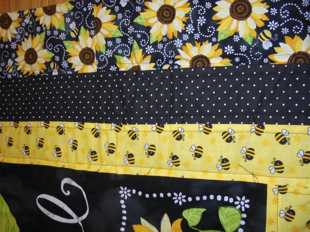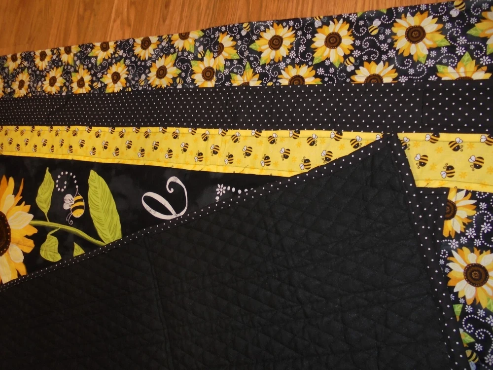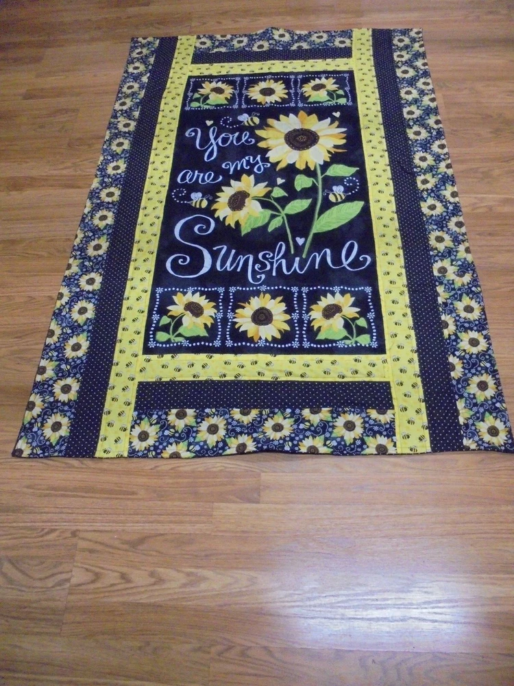 This exquisite quilt is a perfect addition to your home decor, featuring a vibrant and eye-catching design. It is made using quality fabrics and patchwork technique, ensuring durability and longevity. The quilt measures 43 x 62 inches and is handcrafted with love in the United States. The colorful pattern of this handmade creation is sure to brighten up any room. Its unique and novel design makes it a great addition to any child or grandchilds room great for twins. Whether you're snuggling up on the couch or using it as a throw blanket, this quilt is both practical and beautiful. Bring some timeless treasure to your home with this You Are My Sunshine quilt.