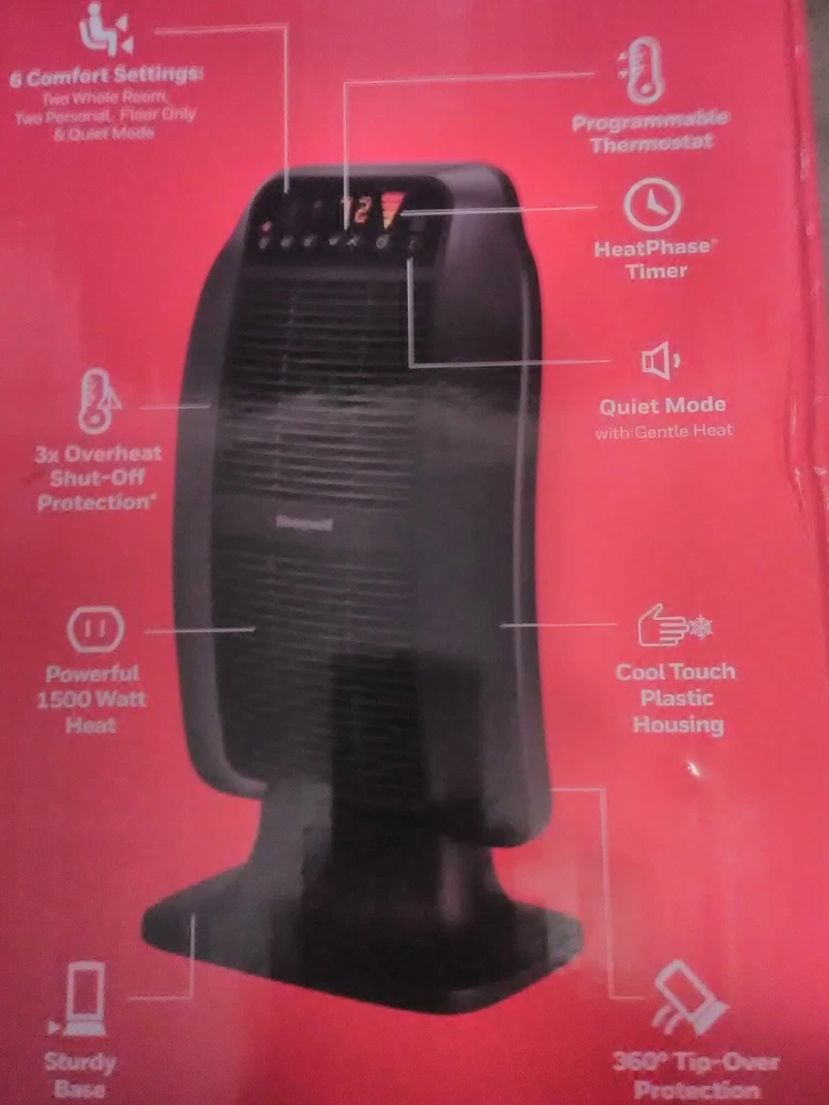 Model - HCE845B NO STOCK PHOTOS NEW Easy to use digital controls with LED display Programmable thermostat 6 heat setting options for customized comfort Tip-over protection automatically shuts the heater off if tipped in any direction Cool touch handle and housing Overheat protection High quality, heat resistant plastic Stable, sturdy base Personal Setting: Top only heating for comfort when seated or relaxing Room Setting: Total heating for whole room comfort Floor Setting: Bottom only heating to warm floor or cold feet Quiet Mode: A heat setting that combines gentle white noise with soothing warmth Provides a subtle background sound to sooth and relax NEW HeatPhase Timer - a phased 30 minute - 2 hour auto-off timer that adjusts heat down a level every 30 minutes until the heater turns off Original owner FREE shipping insurance included