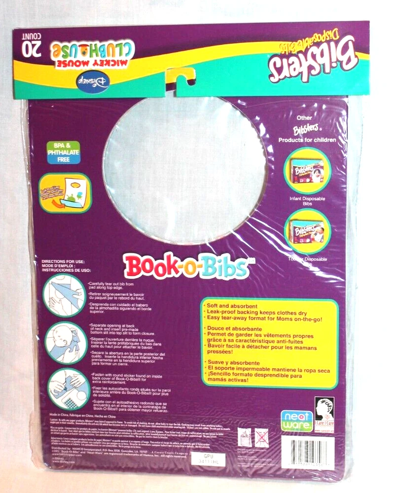 This is for A NEW IN PACKGE DISNEY BIBSTERS DISPOSABLE BIBS MICKEY MOUSE CLUBHOUSE 2- DESIGNS 20 COUNT BOOK OR BIBS TEAR EM AND WEAR EM 9" X 13" Payment must be made within 7 days of end of auction. shipping will be usps FIRST CLASS mail including delivery confirmation.