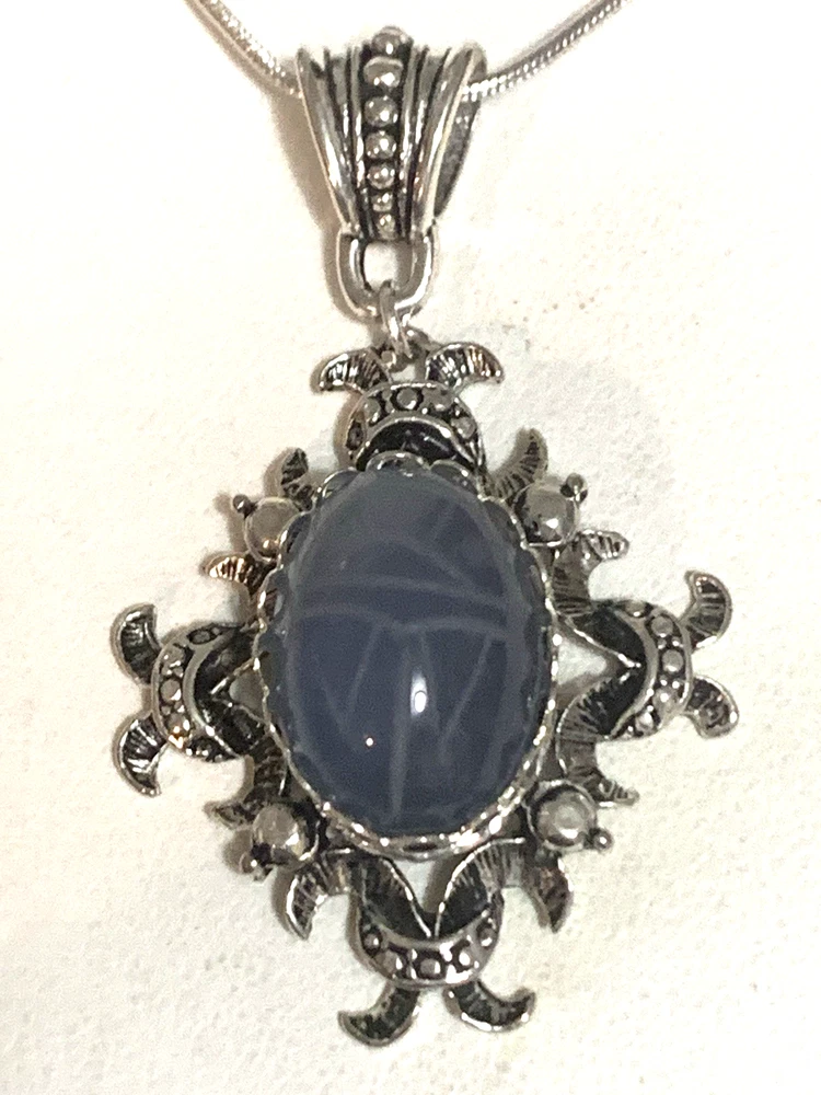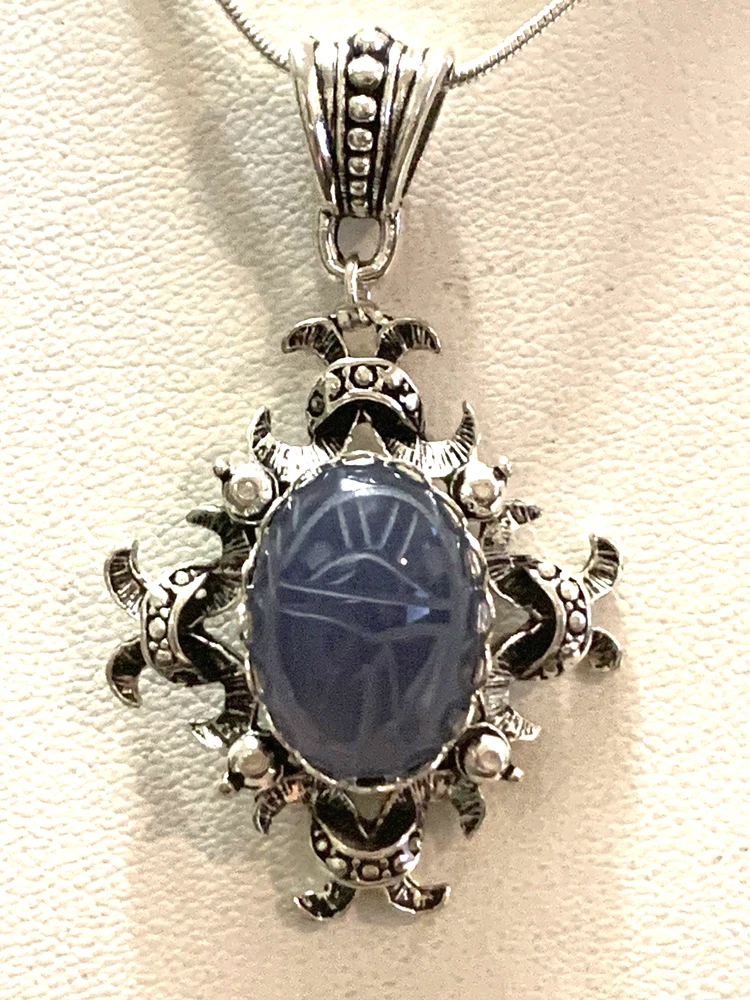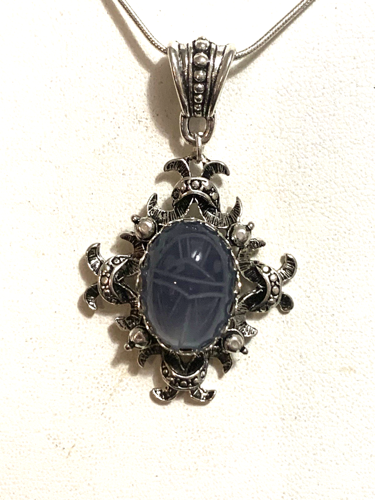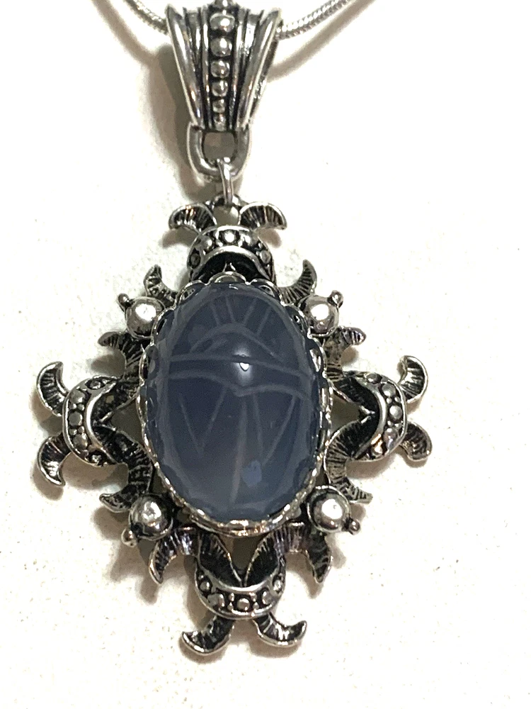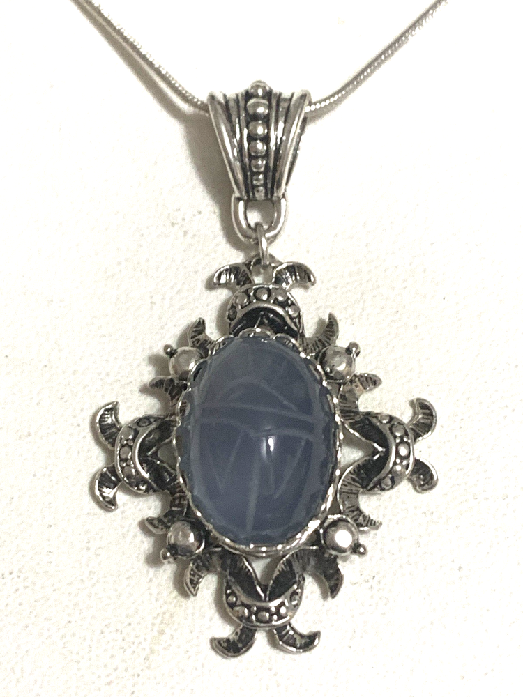 GET READY TO FEAST YOUR EYES ON THIS VERY RARE AND BREATH-TAKING ARTISAN ONE-OF-A-KIND NECKLACE! OFFERED FOR SALE IS THIS EXQUISITE AND UNIQUE VINTAGE, HAND-CARVED, EGYPTIAN NATURAL BLUE CHALCEDONY SCARAB PENDANT NECKLACE. THE EXQUISITE SCARAB IS TOTALLY HANDCRAFTED (HAND CARVED AND POLISHED) BY EGYPTIAN ARTISANS AND METICULOUSLY DESIGNED FROM THE FINEST MATERIALS! THIS STUNNING NECKLACE FEATURES A LARGE 18MMX 13MM X 8MM DEEP ( 5/8" X 3/4" X 1/4") HAND- CARVED, VINTAGE EGYPTIAN BLUE CHALCEDONY SCARAB IN A BEAUTIFUL SOFT BLUE COLOR. I HAVE SET THIS RARE PIECE IN A CROWN BEZEL TO PROTECT THE STONE FROM DAMAGE AND THEN REST IT WITHIN AN EXQUISITE, ROCOCCO CAST, SILVER PLATED SETTING. THE TOTAL DIMENSIONS OF THE PENDANT IS 2" X 1 1/4" . THE GORGEOUS NATURAL BLUE CHALCEDONY SCARAB STONE HAS A TOTAL CARAT WEIGHT OF 13.39 CARATS. FOR A LIMITED TIME ONLY, THIS RARE AND UNIQUE PIECE IS MOUNTED ON A BRAND NEW 18" .925 SILVER PLATED SNAKE CHAIN SO THIS GORGEOUS PIECE IS READY TO WEAR OR GIVE AS A GIFT AS SOON AS IT ARRIVES! EGYPTIAN HISTORY & INTERPRETATIONS OF THE SCARAB TRADITIONAL SCARABS WERE PRODUCED IN VAST NUMBERS FOR MANY CENTURIES AND MANY THOUSANDS HAVE SURVIVED. THEY WERE GENERALLY INTENDED TO BE WORN OR CARRIED BY THE LIVING. THEY WERE TYPICALLY CARVED IN THE FORM OF A SCARAB BEETLE WITH DESIGNS OR HIEROGLYPHICS ON BACK TO FORM AN IMPRESSION SEAL. THE IMPRESSION SEAL WAS USED TO COMMEMORATE SPECIFIC EVENTS WITH THE DATE AND EVENT INSCRIBED. THE SCARAB BEETLE ROLLS ITS FOOD INTO A BALL, SUGGESTING TO THE ANCIENT EGYPTIANS THE ROLLING OF THE ALL - POWERFUL SUN ACROSS THE SKY. *THUS, THE SCARAB BECAME THE SYMBOL OF THE SUN GOD. THE BEETLE, WHICH LIVES UNDERGROUND, WAS BELIEVED TO BE REBORN EVERY DAY AT NOON WHEN IT CAME TO THE SURFACE TO TAKE FLIGHT. **THE SCARAB BECAME THE SYMBOL OF RESURRECTION AND ETERNAL LIFE. ***SHIPPING COST INCLUDES TRACKING AND DELIVERY CONFIRMATION**** **** SHIPPING FEES ARE NOT REFUNDABLE**AND RETURN SHIPPING IS TO BE PAID BY BUYER**