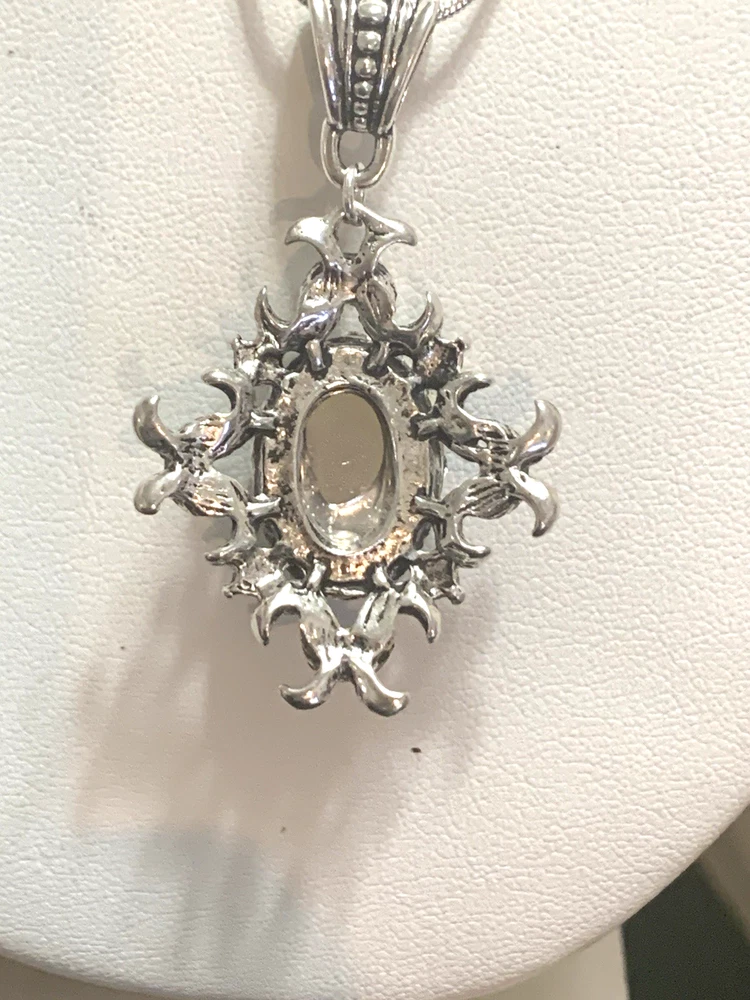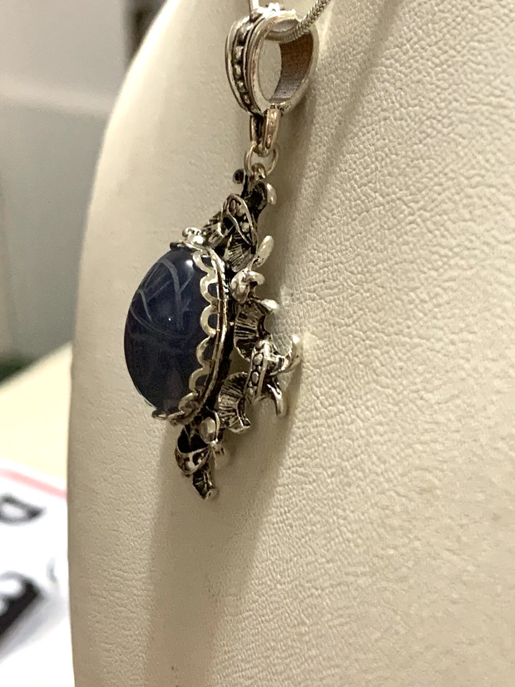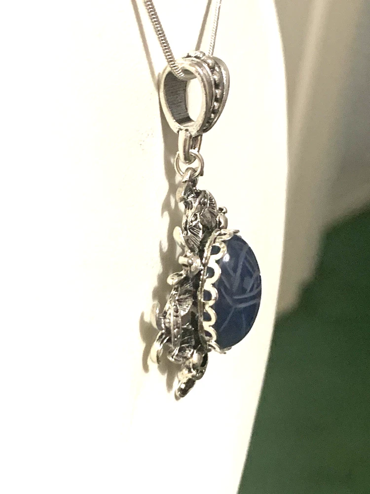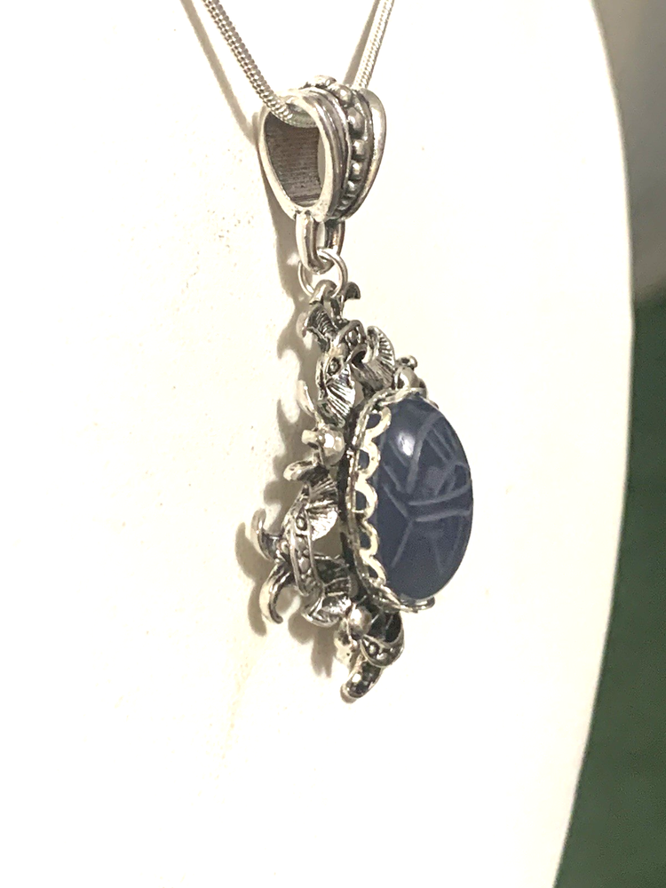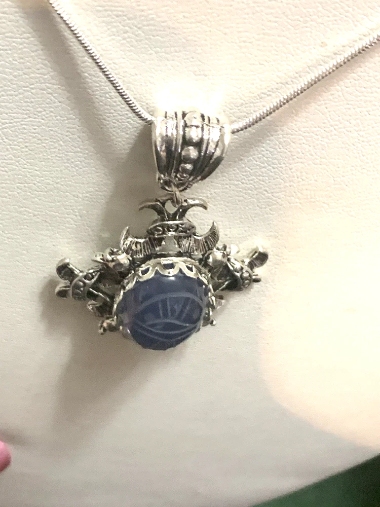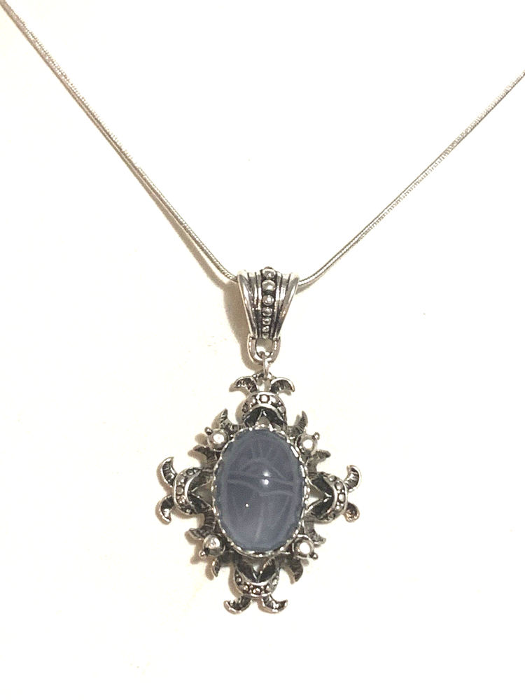 GET READY TO FEAST YOUR EYES ON THIS VERY RARE AND BREATH-TAKING ARTISAN ONE-OF-A-KIND NECKLACE! OFFERED FOR SALE IS THIS EXQUISITE AND UNIQUE VINTAGE, HAND-CARVED, EGYPTIAN NATURAL BLUE CHALCEDONY SCARAB PENDANT NECKLACE. THE EXQUISITE SCARAB IS TOTALLY HANDCRAFTED (HAND CARVED AND POLISHED) BY EGYPTIAN ARTISANS AND METICULOUSLY DESIGNED FROM THE FINEST MATERIALS! THIS STUNNING NECKLACE FEATURES A LARGE 18MMX 13MM X 8MM DEEP ( 5/8" X 3/4" X 1/4") HAND- CARVED, VINTAGE EGYPTIAN BLUE CHALCEDONY SCARAB IN A BEAUTIFUL SOFT BLUE COLOR. I HAVE SET THIS RARE PIECE IN A CROWN BEZEL TO PROTECT THE STONE FROM DAMAGE AND THEN REST IT WITHIN AN EXQUISITE, ROCOCCO CAST, SILVER PLATED SETTING. THE TOTAL DIMENSIONS OF THE PENDANT IS 2" X 1 1/4" . THE GORGEOUS NATURAL BLUE CHALCEDONY SCARAB STONE HAS A TOTAL CARAT WEIGHT OF 13.39 CARATS. FOR A LIMITED TIME ONLY, THIS RARE AND UNIQUE PIECE IS MOUNTED ON A BRAND NEW 18" .925 SILVER PLATED SNAKE CHAIN SO THIS GORGEOUS PIECE IS READY TO WEAR OR GIVE AS A GIFT AS SOON AS IT ARRIVES! EGYPTIAN HISTORY & INTERPRETATIONS OF THE SCARAB TRADITIONAL SCARABS WERE PRODUCED IN VAST NUMBERS FOR MANY CENTURIES AND MANY THOUSANDS HAVE SURVIVED. THEY WERE GENERALLY INTENDED TO BE WORN OR CARRIED BY THE LIVING. THEY WERE TYPICALLY CARVED IN THE FORM OF A SCARAB BEETLE WITH DESIGNS OR HIEROGLYPHICS ON BACK TO FORM AN IMPRESSION SEAL. THE IMPRESSION SEAL WAS USED TO COMMEMORATE SPECIFIC EVENTS WITH THE DATE AND EVENT INSCRIBED. THE SCARAB BEETLE ROLLS ITS FOOD INTO A BALL, SUGGESTING TO THE ANCIENT EGYPTIANS THE ROLLING OF THE ALL - POWERFUL SUN ACROSS THE SKY. *THUS, THE SCARAB BECAME THE SYMBOL OF THE SUN GOD. THE BEETLE, WHICH LIVES UNDERGROUND, WAS BELIEVED TO BE REBORN EVERY DAY AT NOON WHEN IT CAME TO THE SURFACE TO TAKE FLIGHT. **THE SCARAB BECAME THE SYMBOL OF RESURRECTION AND ETERNAL LIFE. ***SHIPPING COST INCLUDES TRACKING AND DELIVERY CONFIRMATION**** **** SHIPPING FEES ARE NOT REFUNDABLE**AND RETURN SHIPPING IS TO BE PAID BY BUYER**