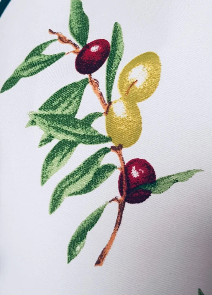 This NEW Italian Cotton Kitchen Apron features a traditional style with an olive pattern, perfect for adding a touch of Mediterranean charm to your cooking routine. Made of cotton, this one-size-fits-all chef apron is machine washable up to 100°F for easy care. This multicolored apron is crafted in Italy and ideal for use in the kitchen, making it a practical and stylish addition to your home decor.