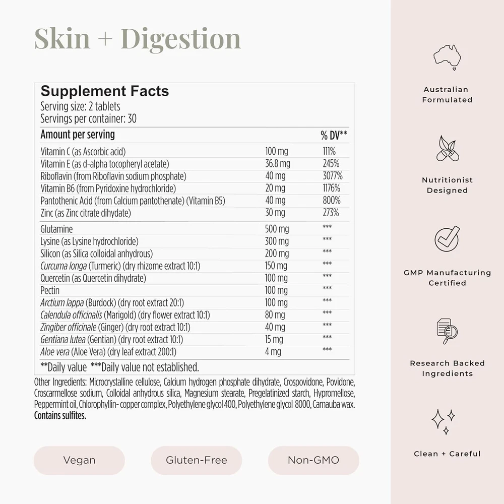 JSHealth Vitamins Skin and Digestion Formula | Skin Supplement with Zinc | Burdock Turmeric | Clear Healthy Skin | Acne Treatment for Teens and Adults | (60 Tablets) Beautiful Glowing Skin - Eczema and blemish control, reduce cystic pimples, blackheads, redness, face bumps, large pores, menstrual hormonal breakouts, adult acne supplements, scarring, rough texture, and dermatitis Healthy Digestion - Naturally maintain and support gastrointestinal health, ease bloating and gas for a more flat stomach, look and feel better Comprehensive & Proven Health Benefits: This vegan vitamin formula is based off of clinical trials that have shown these ingredients to improve skin and digestion. Committed To Quality, Purity & Safety: Produced to the highest cgmp(certified good manufacturing practices) standards in our state-of-the-art Australian facility. Clean Formula: Gluten free, dairy free, lactose free, soy free, sugar free, nut free (including peanuts and tree nuts) no yeast, fish, lactose, eggs, msg, sulfites, wheat, artificial colors, flavors, sweeteners, bee products, soy or corn.