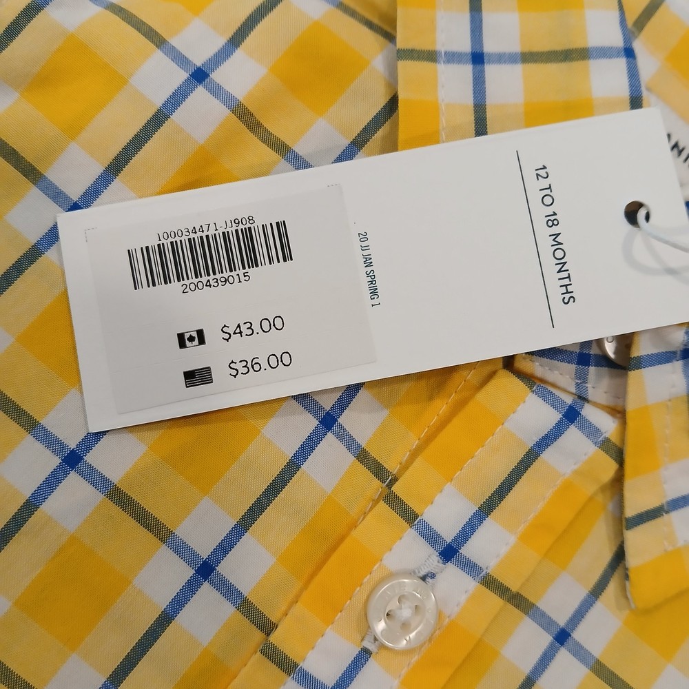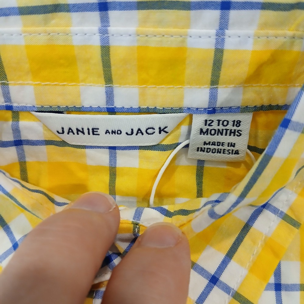 Size: 12-18 Months Fit: Regular Garment Care: Machine Washable Season: Fall, Spring, Summer, Winter Closure: Button Accents: Button Country of Origin: China UPC: Does not apply Neckline: Collared Material: 100% Cotton Features: All Seasons, Easy Care, Pocket Collar Style: Button-Down Character: Boy Department: Boys Vintage: No Occasion: Activewear, Casual, Formal, Party, Wedding Fabric Type: Down Brand: Janie and Jack Style: Basic Personalize: No Sleeve Length: Long Sleeve gtin13: Does not apply Color: Multicolor Pattern: Plaid Handmade: No Type: Button-Up Theme: Easter