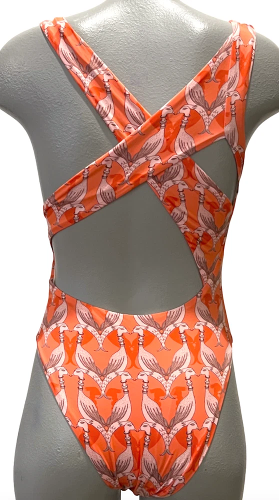 ~ * New La Gotta Bird Zariah Crossback One Piece Swimsuit Size Small * ~ * **New without hang/price tags and never worn. **THE INNER LABEL HAS BEEN MARKED TO PREVENT RETAIL RETURNS. * Brand ~ La Gotta * Style ~ Bird Zariah One Piece Swimsuit * Size ~ Small * Color ~ Orange bird print * Retail price ~ $179 * This one piece swimsuit is classic yet unique with its interesting cut-out back detail and beautiful birds print. Its grapefruit color will beautify your tan. * Pull on style * Hand wash * 80% polyester 20% spandex