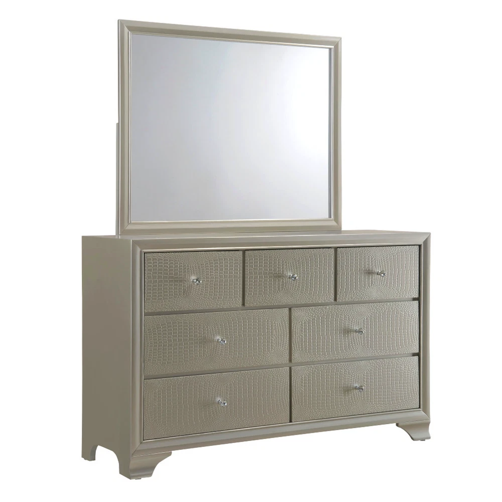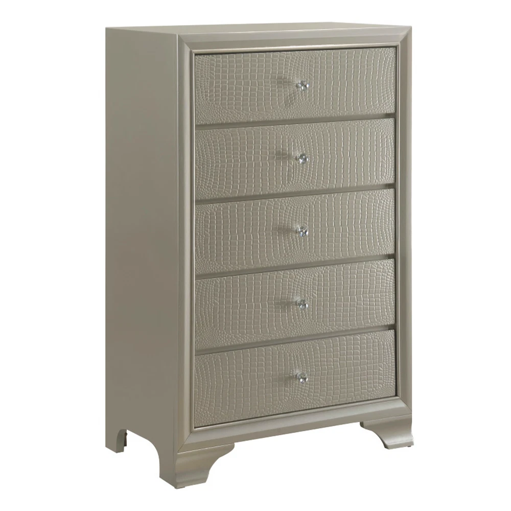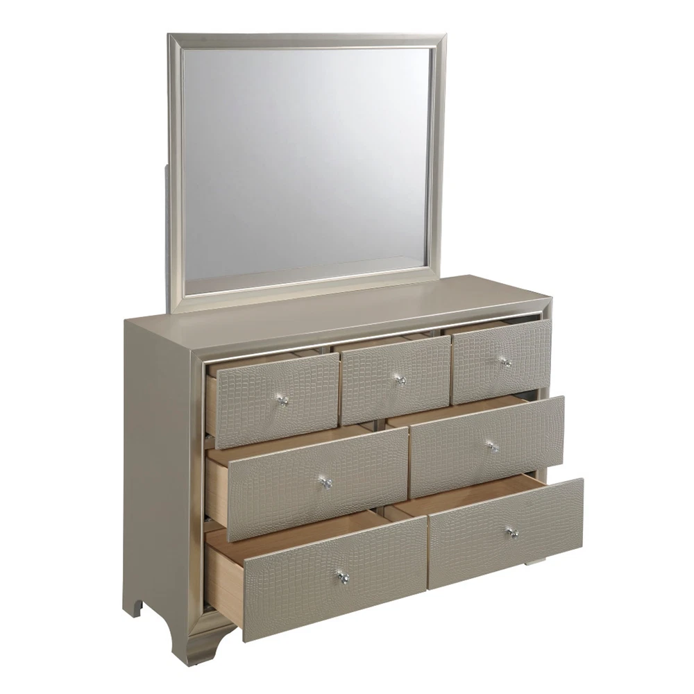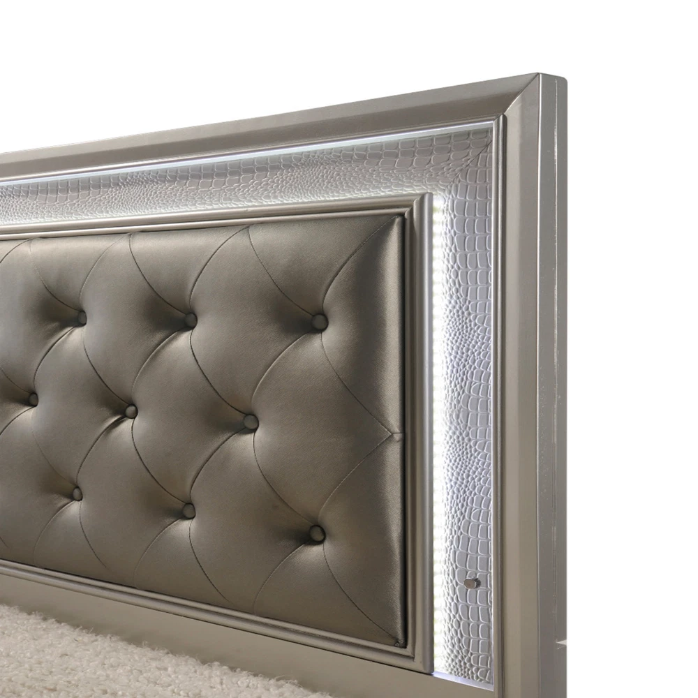 Finish: Champagne, Gold Style: Modern, Contemporary, Chic, Glam Handle Finish: Crystal Features: Embossed Faux Crocodile Leather, LED Functionality Room: Bedroom Compatible Mattress Size: Full, King, Queen, Twin Set Includes: Drawers, LED Headboard, Bed, Bedframe, Chest of Drawers, Dresser, Footboard, Mirror, Nightstand Color: Champagne, Gold Number of Items in Set: 5 Number of Drawers: 14, 16 Material: Hardwood, Wood Veneer Brand: CM Assembly Required: Yes