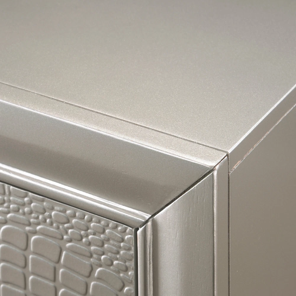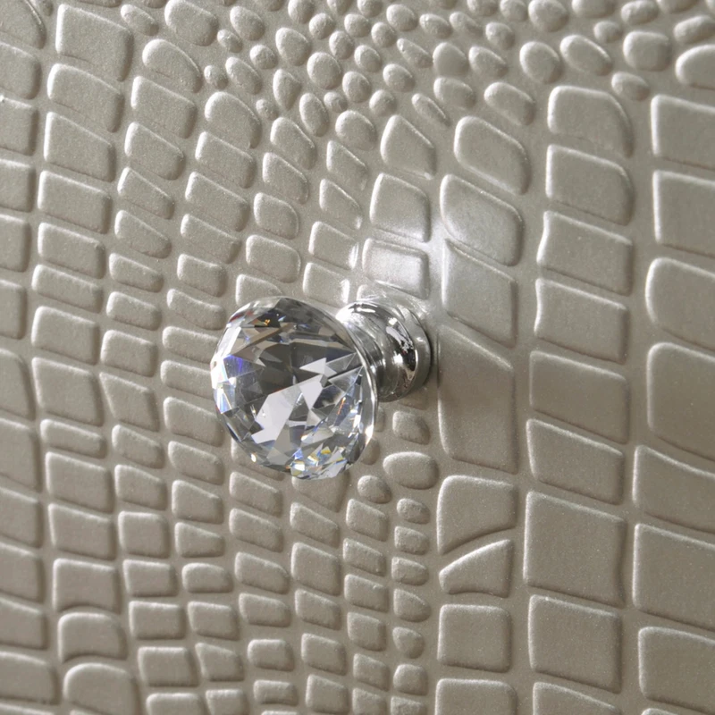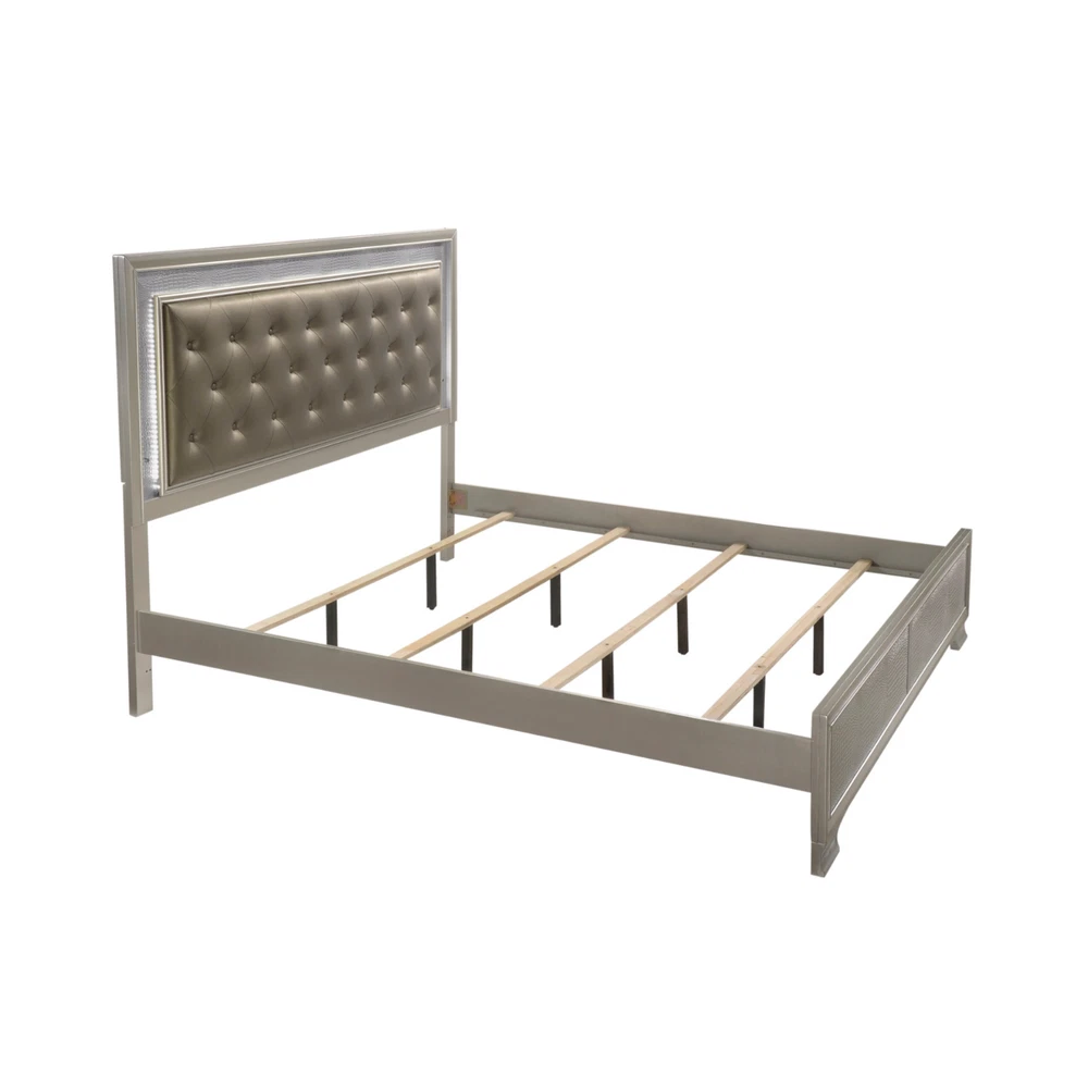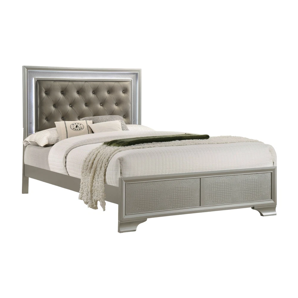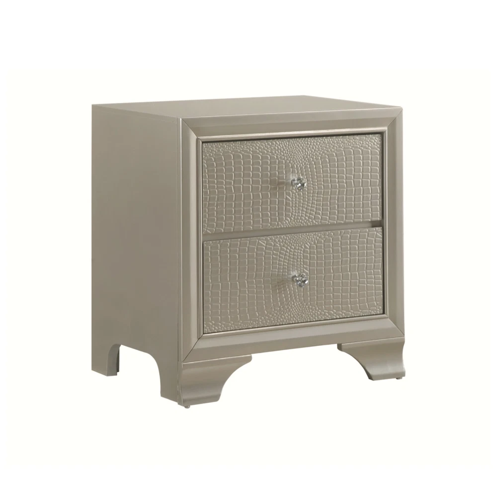 Finish: Champagne, Gold Style: Modern, Contemporary, Chic, Glam Handle Finish: Crystal Features: Embossed Faux Crocodile Leather, LED Functionality Room: Bedroom Compatible Mattress Size: Full, King, Queen, Twin Set Includes: Drawers, LED Headboard, Bed, Bedframe, Chest of Drawers, Dresser, Footboard, Mirror, Nightstand Color: Champagne, Gold Number of Items in Set: 5 Number of Drawers: 14, 16 Material: Hardwood, Wood Veneer Brand: CM Assembly Required: Yes