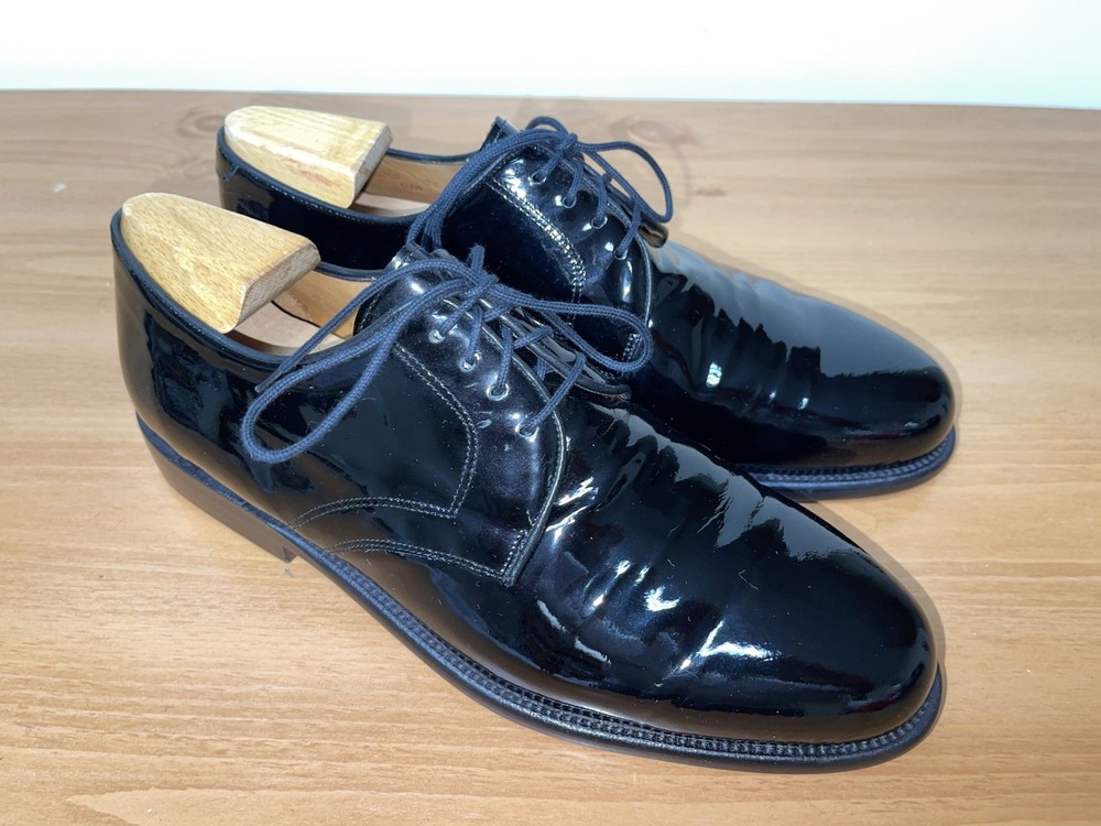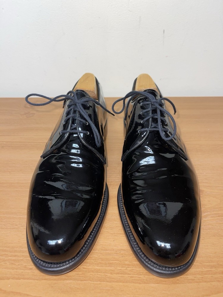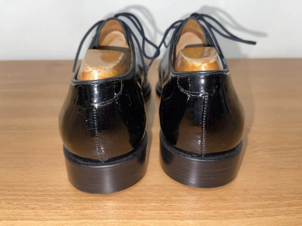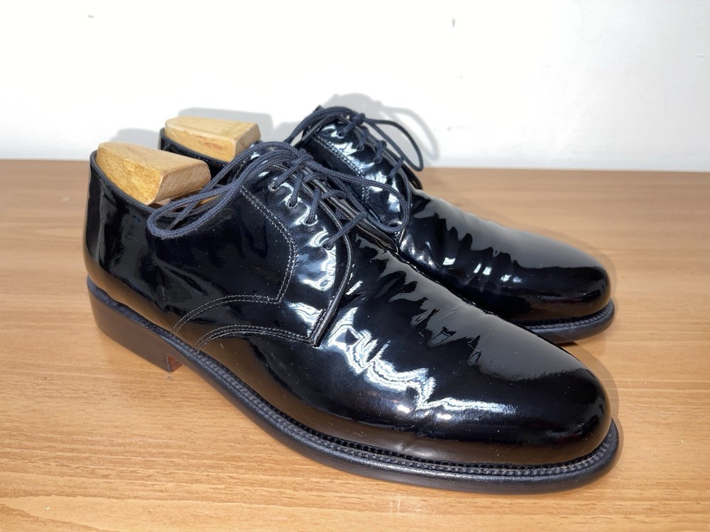 These Land's End men's black patent leather tuxedo shoes in size 9M are a stylish and comfortable choice for any formal occasion. With a classic round toe shape and lace-up closure, these Oxford-style shoes feature a solid black color and are made of high-quality leather both inside and out. Designed for comfort, these dress shoes are perfect for year-round wear and can be easily paired with a tuxedo or a dressier outfit for a sophisticated look. Made in Brazil, these shoes are a timeless addition to any man's wardrobe. New without box. Shipped with USPS ground advantage.