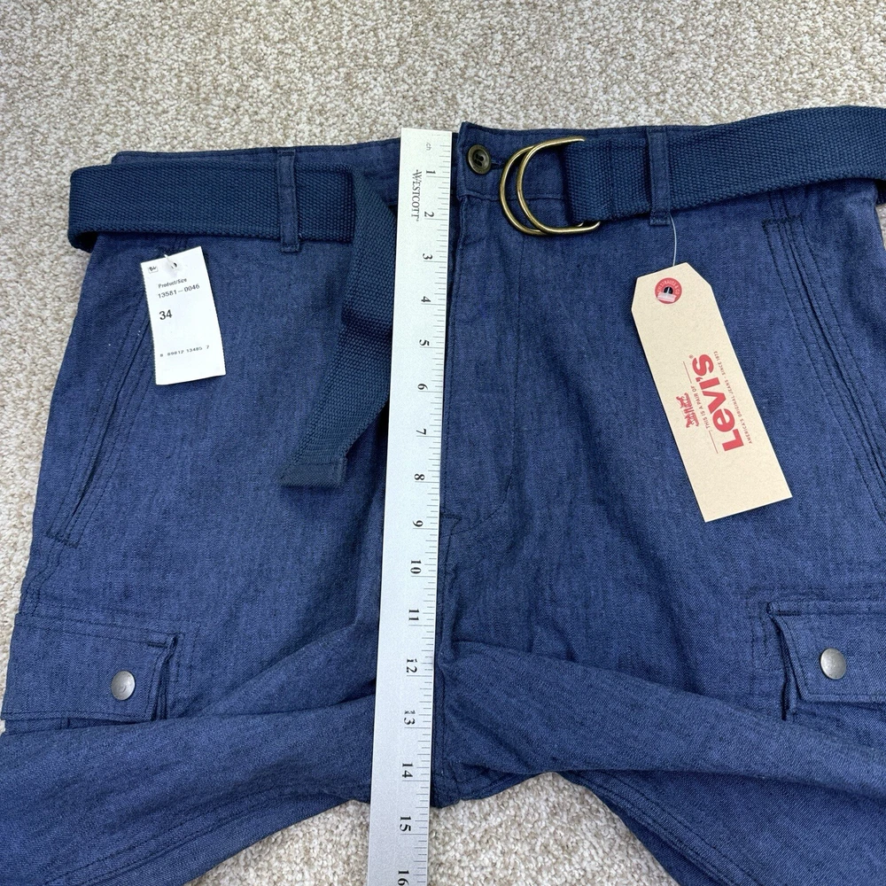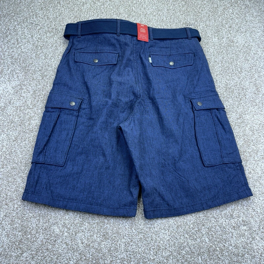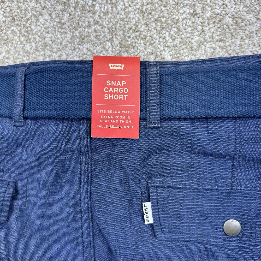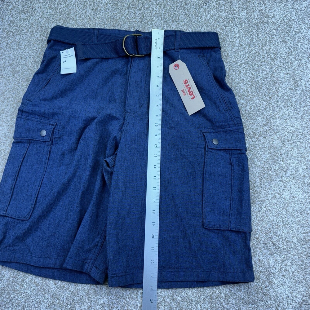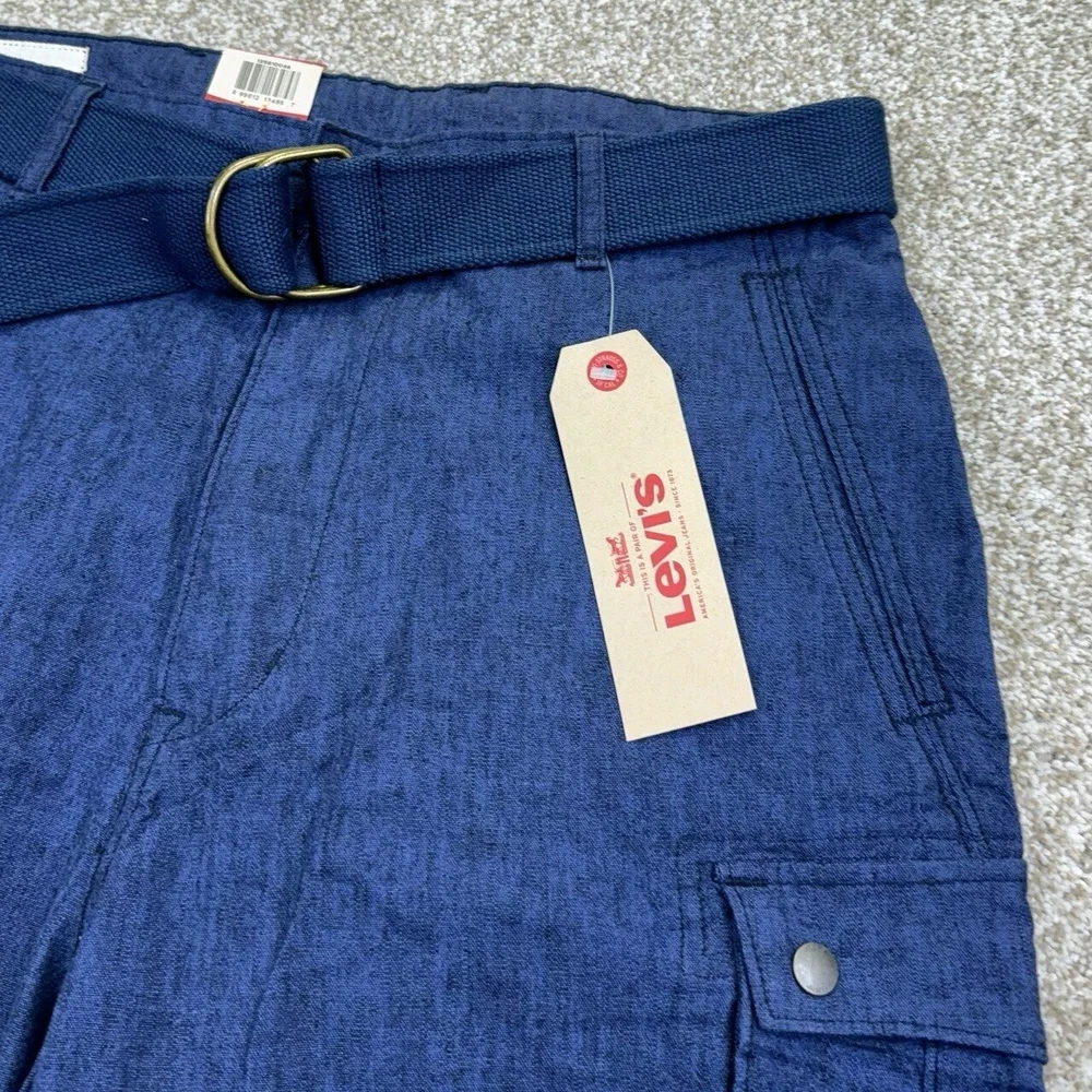 NWT Levis Linen Blend Snap Cargo Shorts Mens Size 34 Blue Belted Falls Below Knee. Condition is New with Tags. Shipped Standard. See Photos With Measurements.