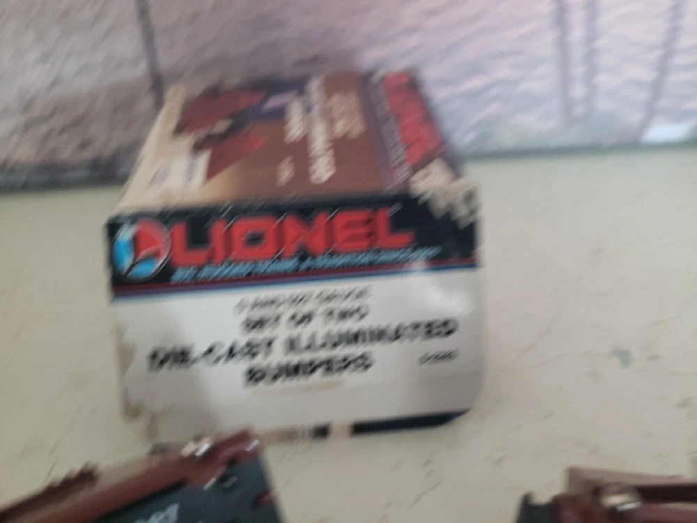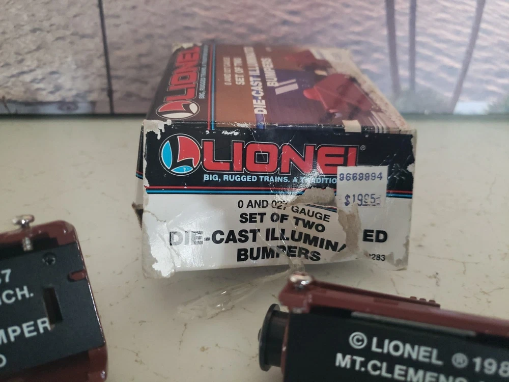 Brand new never used box is rough.The Lionel O27 Gauge Die-cast set of 2 Illuminated Bumpers 6-2283 from 1987 is a ready-to-go pre-built accessory for O gauge model railroads. Made of die-cast brown material, these illuminated bumpers are designed at a 1:48 scale for ages 12-16. Perfect for enhancing your model railroad layout, these bumpers add a realistic touch and provide a functional way to guide trains around curves and prevent derailments.