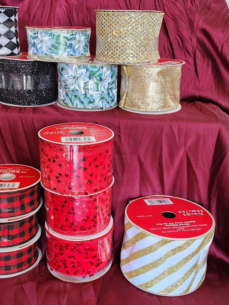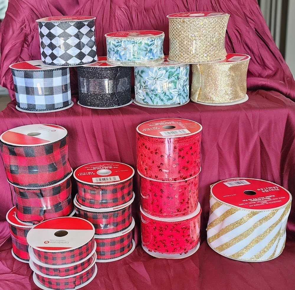The product is a lot of 20 rolls of wire edge ribbon in various colors including red, gold, and black, as well as patterns. The ribbons are made of polyester and come in a ribbon spool format. They are all wire-edged and have a width that varies. The brand is Celebrate It and the items are custom bundled. The ribbon is from Taiwan and suitable for various crafting projects.