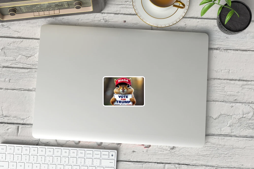 This unique sticker features an adorable squirrel proudly wearing a MAGA hat and holding a “Vote for Trump” sign. Perfect for political enthusiasts, animal lovers, and anyone with a good sense of humor, this sticker adds a playful twist to the world of political memorabilia. It’s a fun, lighthearted way to showcase your support! Crafted from high-quality vinyl with a protective laminate, this sticker is designed for vibrant indoor use on laptops, notebooks, water bottles, and more. Note: It is not weatherproof and may fade if exposed to outdoor elements. Key Features: Charming design with a pro-Trump squirrel in a MAGA hat holding a "Vote for Trump" sign Made from premium vinyl for vibrant color and durability Perfect for indoor decoration; not UV or weather-resistant Great gift for supporters, collectors, and those who appreciate whimsical designs Not suitable for extended outdoor use or UV exposure Add this adorable yet patriotic squirrel sticker to your collection, or gift it to a fellow fan!