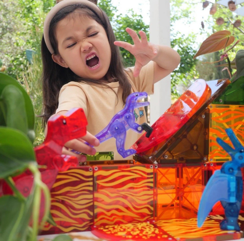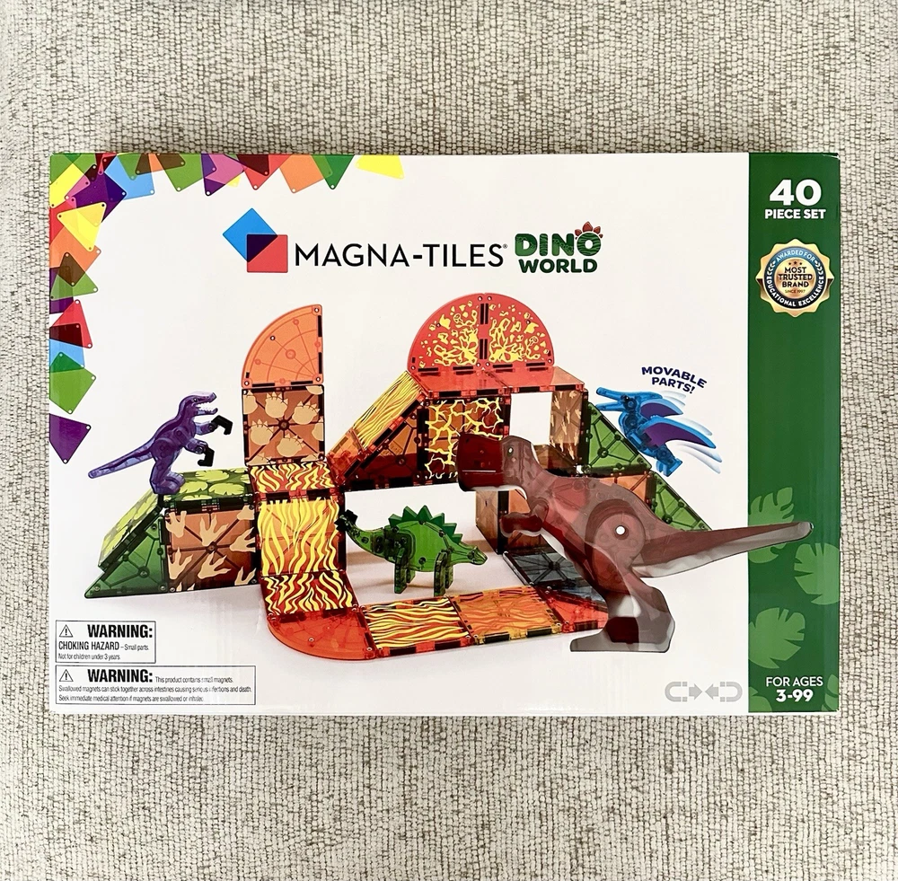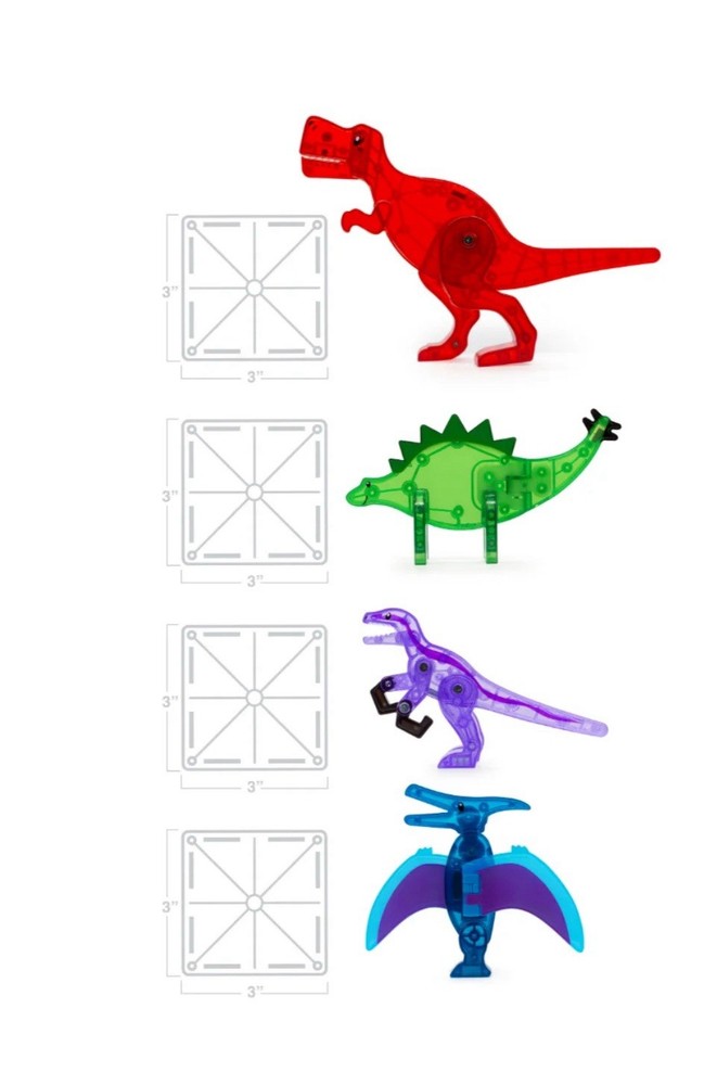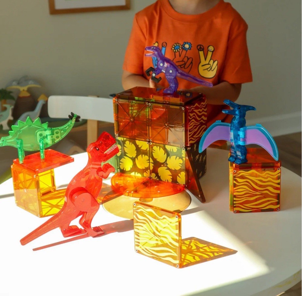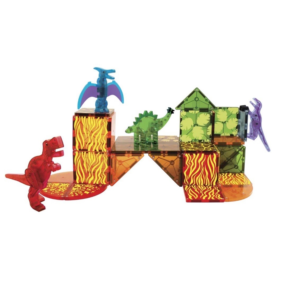 What’s Included: 4 Dinosaur Figurines including Pteranodon (Blue), T-Rex (Red), Stegosaurus (Green) and Velociraptor (Purple), 24 Small Squares, 6 Right Triangles, 2 Rectangles (1 Large, 1 Small), 4 Quarter Circles What Makes It Unique: Features volcanic-themed tiles that are erupting with play potential. Developmental: Certified STEAM toy, per Dr. Gummer’s Good Play Guide™, in partnership with The Toy Association™, for aiding in the development of fine motor skills, cognitive skills, language skills, social skills, teamwork and creativity. Great for Gifting: Makes a great gift for little child paleontologists ages 3+ to help spur their love for dinosaurs! More to Explore: Check out the popular Dino World XL 50-Piece set and Dinos 5-Piece figure set for more prehistoric play. Always Compatible: All pieces are compatible with and complementary to all other MAGNA-TILES® sets. Safety Guaranteed: All MAGNA-TILES pieces are built to withstand countless hours of playtime. Our signature lattice prevents cracking, while fastening rivets keep magnets safe and secure.
