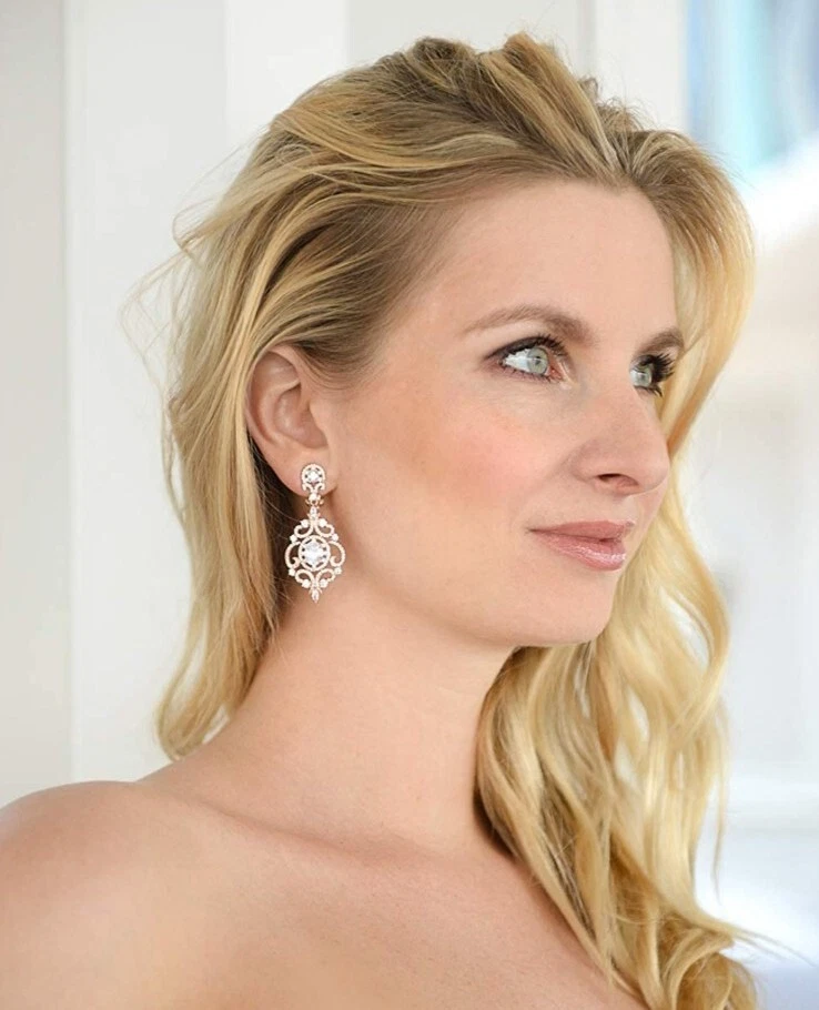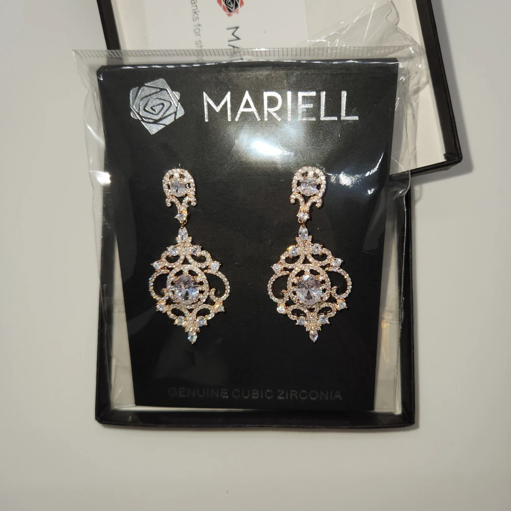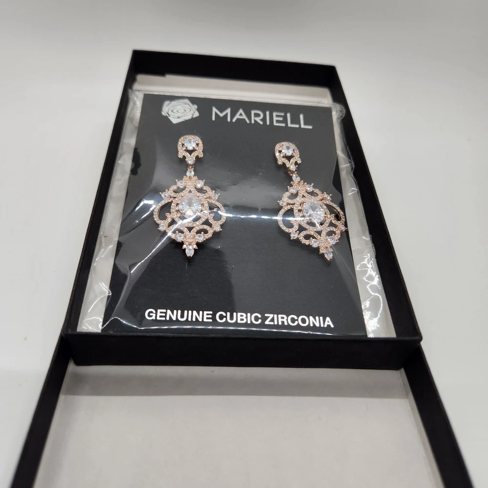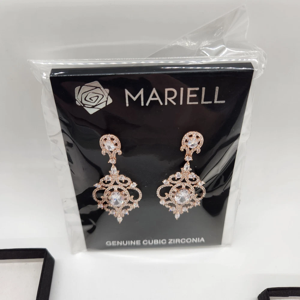 Brand: Mariell lot: No Signed?: Unsigned Cut Grade: Very Good Material: Metal Main Stone Creation: Unknown Era: Victorian Country of Origin: United States Main Stone: Cubic Zirconia Main Stone Color: White/Colorless Use Occasion: Wedding Ear Area: Lobe Style: Chandelier Gender: Female Main Stone Shape: Round Theme: Fashion & Luxury Color: Rose Gold Main Stone Treatment: Heated & Pressure Treated Metal: Rose Gold Filled Setting Style: Bezel Type: Earrings Closure: Hanging Backing