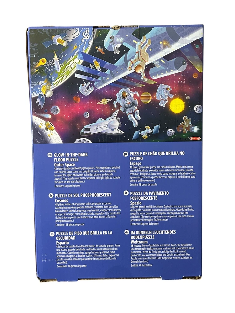 This Melissa & Doug Floor Puzzle is an excellent addition to any child's toy collection. With 48 pieces, it provides hours of entertainment and challenges children's problem-solving skills. The puzzle features a galaxy color scheme and a space theme, which is perfect for children who love outer space. The puzzle is designed for children aged 3-11 years old and has a length of 11.7 inches, a width of 8 inches, and a height of 5.2 inches. It weighs 2.000 pounds and comes with the manufacturer part number MD31010. The puzzle is made by Melissa & Doug, a well-known brand that produces high-quality toys. This particular puzzle has a glow-in-the-dark feature, making it fun and exciting for children to play with. Box is brand new. I will deliver if you are in the area. Fort Worth 76115