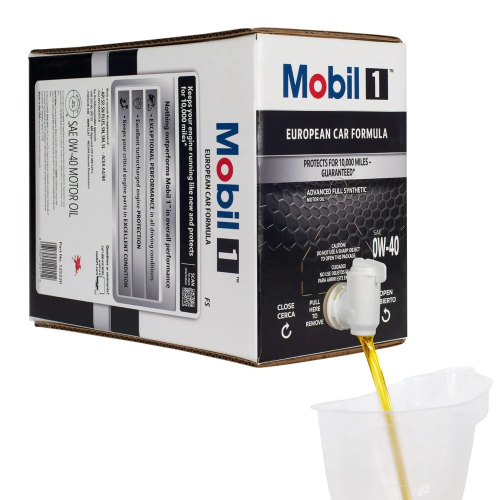 Mobil 1 FS European Car Formula 0W-40 helps to extend engine life, even in severe conditions, and protects critical engine parts for up to 10,000 miles between oil changes*. Its uniform synthetic oil molecules reduce friction, helping to prevent deposits and sludge buildup. This technologically advanced formulation provides excellent internal engine heat protection (up to 500 degrees Fahrenheit), and low-temperature protection (to -40 degrees Fahrenheit), supporting quick cold-weather starting and ultra-fast protection. Same oil. Less waste. Mobil 1 12 quart convenience pack (bag in box) uses 87% less plastic and is manufactured in a zero waste to landfill facility. Mobil 1 FS European Car Formula 0W-40 also helps control oxidation to prevent oil breakdown. Approved for many Mercedes-Benz, VW, Audi and Porsche vehicles, this formula provides excellent turbocharged engine protection. Mobil 1 is America’s leading synthetic motor oil brand at retail**, recommended by car builders and experienced mechanics, and is the Official Motor Oil of NASCAR Mobil 1 FS European Car Formula full synthetic motor oil 0W-40 helps to extend engine life even in severe conditions Helps to control oxidation to prevent oil breakdown and maintain excellent viscosity for up to 10,000 miles between oil changes* Provides outstanding engine wear protection and performance with uniform synthetic oil molecules for better friction reduction Keeps your engine running like new by working to prevent damaging deposits and sludge buildup Provides excellent internal engine heat protection (up to 500 degrees F) and low temperature protection (up to -40 degrees F) Motor oil type Full Synthetic Motor Oils Motor oil viscosity 0W - 40 Material Synthetic Size 12 qt Has written warranty Yes - Warranty URL Piece count 12 Compatible cars Mercedes-Benz|Vw|Audi|Porsche Volume capacity 384 fl oz Brand Mobil 1 Diesel fuel compatible N Has high mileage additives N Vehicle make Mercedes-Benz|Vw|Audi|Porsche
