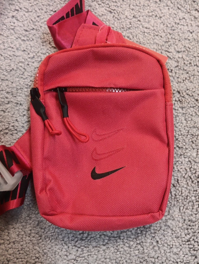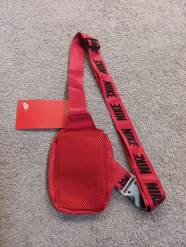 Introducing a brand new Nike crossbody shoulder chest travel mini sling bag, perfect for those who love sports and travel. Made of high-quality polyester, this bag is lightweight and durable. It features a solid bright red exterior color, with a zip closure and adjustable cross-body strap for easy access. Measuring 5 inches in width and 7 inches in height, this mini bag is perfect for carrying your essentials while on the go. It also comes with additional features such as a zip-around closure and an unisex design, making it a versatile choice for anyone who wants to keep their hands free. Get your hands on this Nike mini sling bag today!