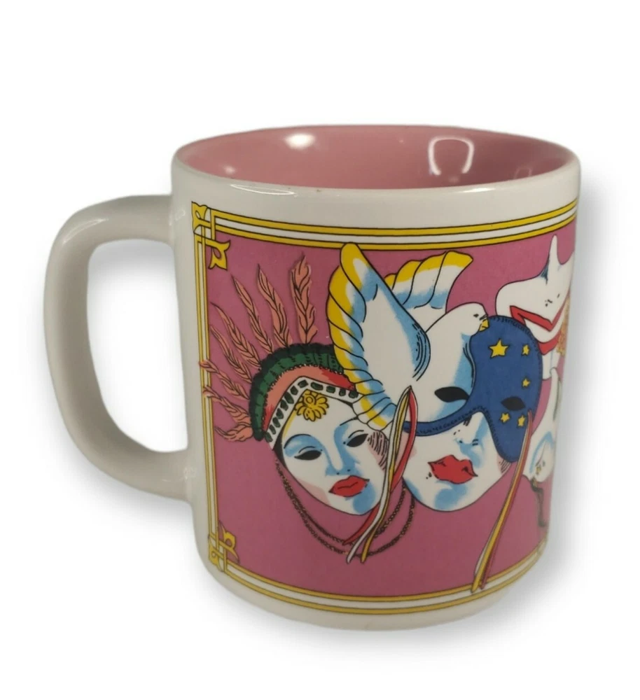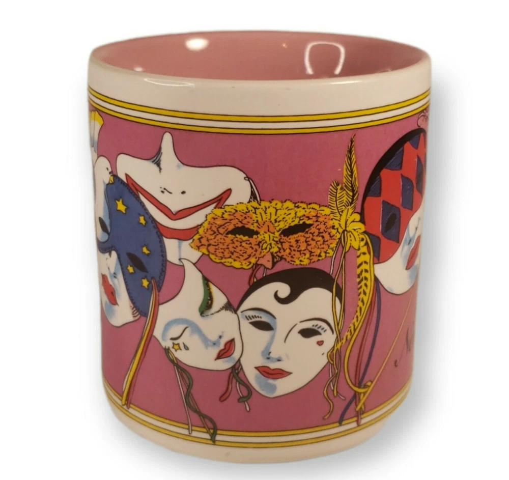 NEW ORLEANS Louisiana MARDI GRAS Mask COFFEE MUG Pink Souvenir Cup FAT TUESDAY. Great shape, no cracks or chips - pink glazed inside