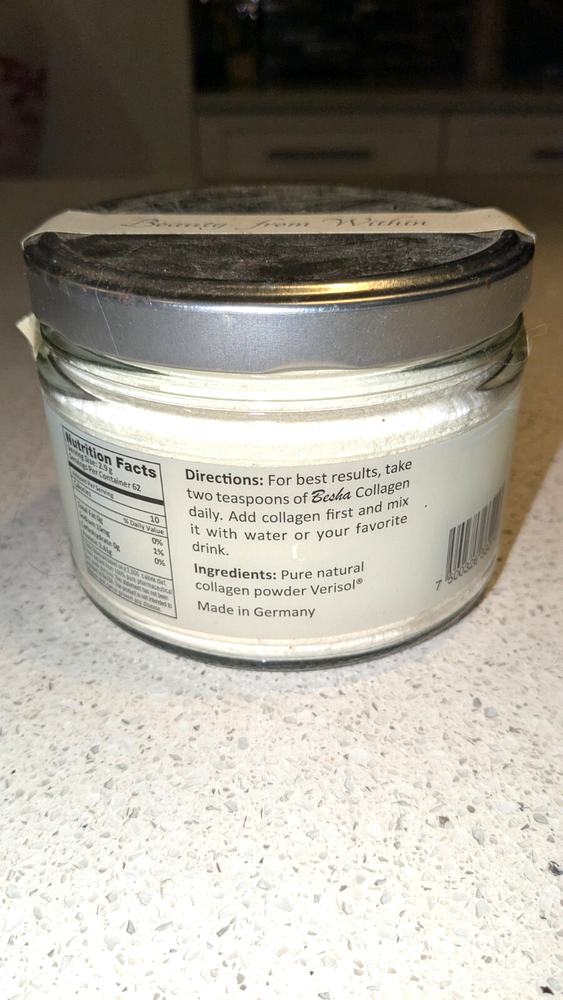 NEW Open Jar-Besha Hydrolyzed Collagen Peptide Natural Beauty from Within Potion, Made in Germany, Retails at twice the price offered here. Shipment via USPS Ground Advantage. Local pickup is also available. "This is the highest quality collagen you will find in the market. It is a patented formula developed in a German lab, and scientifically tested to rejuvenate from within. Besha collagen contains pure Verisol, which is pure collagen. Verisol collagen is a tested non-allergenic as it is the main protein in our body. Verisol has been marketed in Europe, the U.S. and Latin America for over five years, and there has never before been any reports of allergies. Creams and skin lotions only work on the outer layer of the skin the epidermis. Besha collagen, is not only absorbed by the dermis, but stimulates production of your natural collagen! Net Weight: 100 grams (4.0 oz) 35 servings. Directions: Mix 2 teaspoons of Besha Hydrolyzed Collagen in an 8 oz. glass of water, juice or energy drink. Take it daily for best results. Besha contains the same type of collagen used in the most recent scientific study: porcine. This is the highest quality collagen you will find in the market. It is a patented formula developed in a German lab, and scientifically tested to rejuvenate from within. In a recent study subjects who drank Besha collagen for eight weeks, showed significant increase in skin elasticity compared to the placebo group. The most important discovery was that subjects who were administered Besha collagen presented higher levels of procollagen type I by 65 percent and higher levels of elastin by 18 percent. You can read the full research at the U.S. National Journal of Medicine. PMID: 24401291 Other skin products only work on the outer layer of the skin the epidermis. Besha collagen is not only absorbed by the dermis, but stimulates production of your natural collagen! Consumer's report top choice. Natural Food. Clean Label. Non-Allergenic Food. Highly Digestible Food."