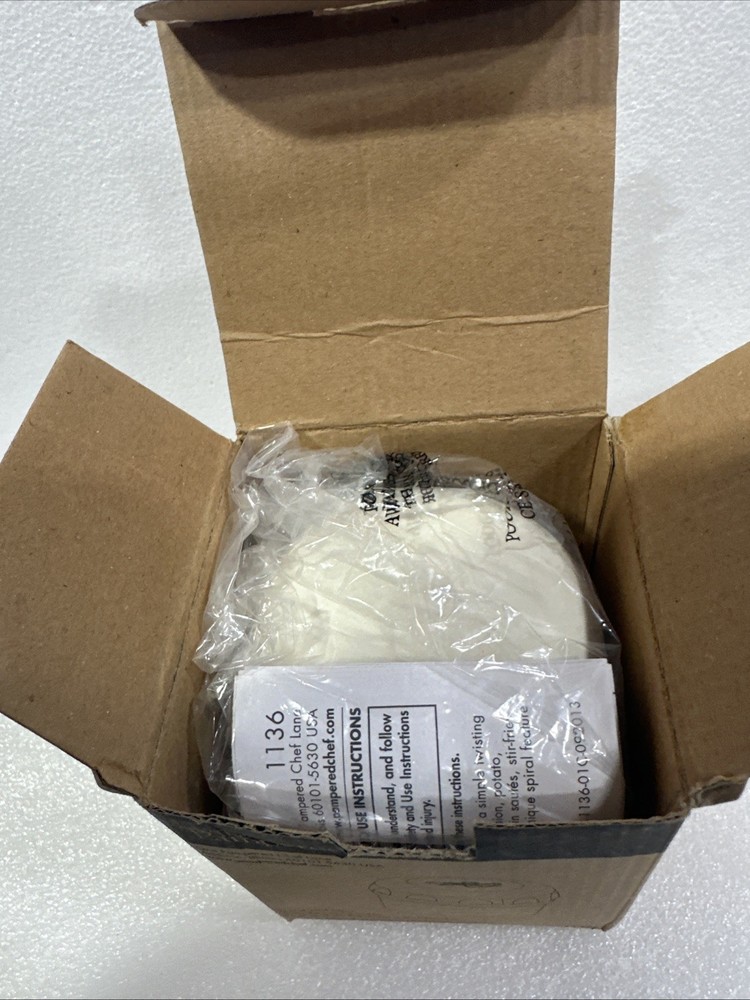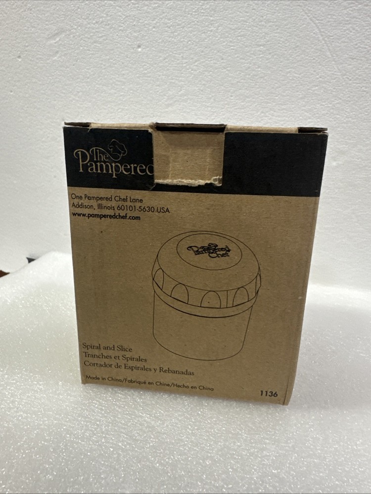 The NEW Pampered Chef Spiral and Slice #1136 Kitchen Tool in White is a versatile food slicer perfect for cutting fruits and vegetables. Made with stainless steel and plastic materials, this slicer from the trusted brand Pampered Chef is easy to use and clean. The set includes the slicer itself, making it a convenient addition to any kitchen. With its compact size and efficient slicing capabilities, this kitchen tool is sure to make meal prep easier and more enjoyable. N-OB