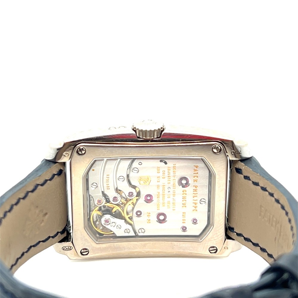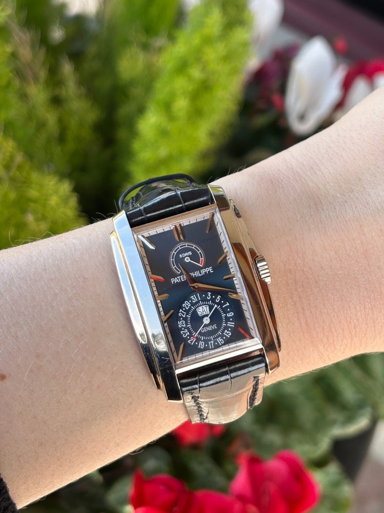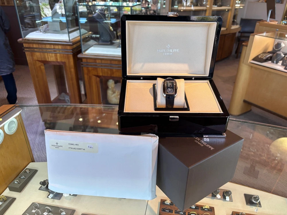For sale is a brand-new Patek Philippe Gondolo 5200G-001 in 18K White Gold. This watch features a blue dial and a manual wind movement with an 8-day power reserve. It also includes a Date-Day function for added convenience. The watch is brand new, from previous store stock, never sold or worn. Details: Model: Gondolo 5200G-001 Material: 18K White Gold Dial Color: Blue Movement: Manual Wind, 8-Day Power Reserve Complications: Date-Day Movement Number: MVT#5781682 Case Number: Case#6005744 Condition: Brand new, never sold, never worn Included: Original papers and box Key Features: 8-day manual wind movement Blue dial with a classic design Date and Day function