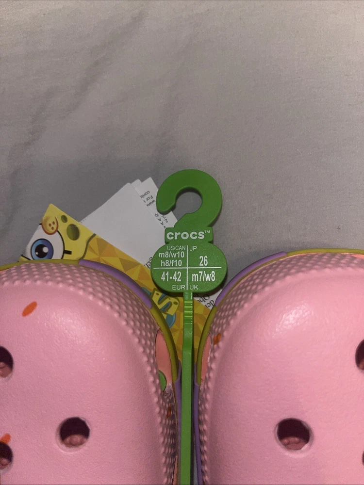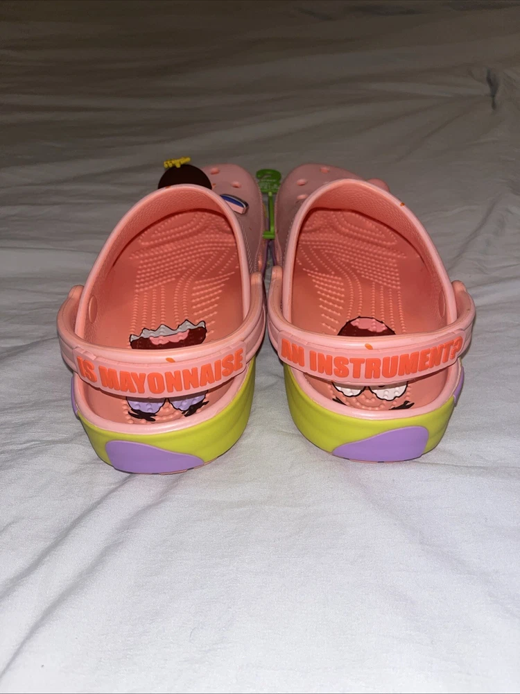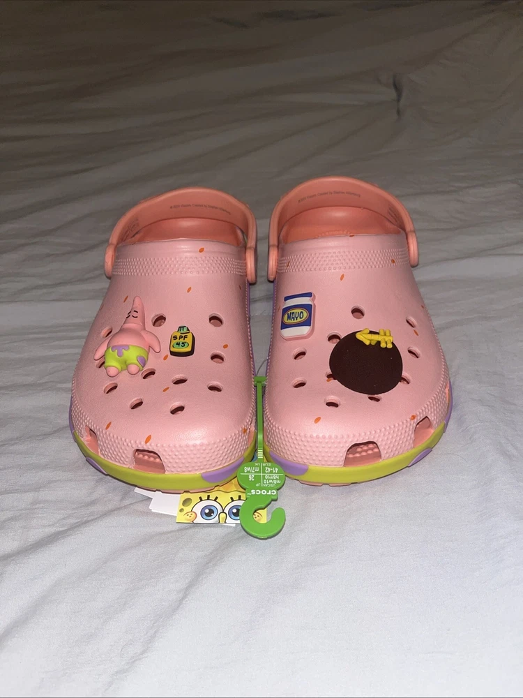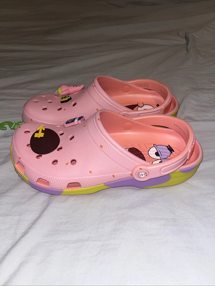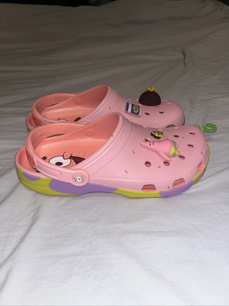 Brand new, never worn, never used. Comes in the original bag This is a pair of NEW Patrick Star SpongeBob SquarePants x Crocs Classic Clog sandals in a vibrant pink color. They feature slip-on style, cushioned insole, adjustable strap, and a lightweight design. The shoes are adorned with logos of the characters Patrick Star and SpongeBob SquarePants, making them a fun and comfortable choice for casual or travel wear during the summer, fall, or spring seasons.