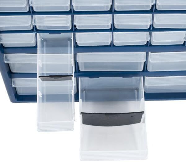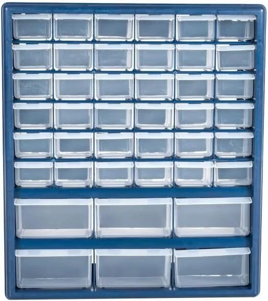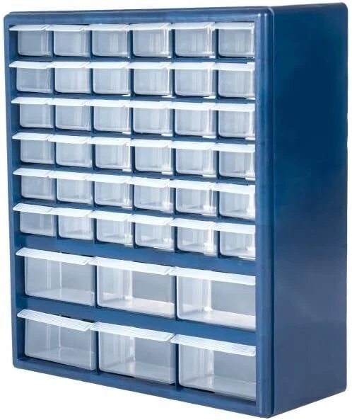 About this item IMPACT RESISTANT MATERIAL – Constructed from durable polypropylene, these storage drawers are made to last, and difficult to damage or break. The strong, see-through clear plastic drawers feature finger grip drawer pulls for easy opening. DESKTOP OR WALL MOUNTABLE – The storage organizer is portable and can be placed on any desk, table, or work surface. The sturdy plastic frame features keyholes on the back for convenient wall mounting in a closet, in a classroom, workshop, or shed. MULTI-PURPOSE – With 42 bins (6 large, 36 small), this cabinet is ideal for storing and organizing everything from fishing tackle, small business supplies, hardware like nuts, screws, and bolts, to crafting materials, beads, makeup, or jewelry. VERSATILE – These organizers are perfect for any area of the house! Get one for your garage, office, kitchen, bathroom, or bedroom. It’s the perfect organizational solution to keep accessories, pieces, or parts nea tly stored and tidy. PRODUCT DETAILS – Material: Polypropylene. Overall Dimensions: (H)17” x (W) 14.5” x (D) 5.25”; Large Drawer Dimensions: (D)5.25” x (W)4.25” x (H) 2.25”; Small Drawer Dimensions: (D)5.25” x (W)2.25” x (H)2.25”. On Oct 24, 2025 at 23:11:13 PDT, seller added the following information: On Nov 21, 2025 at 23:26:35 PST, seller added the following information: