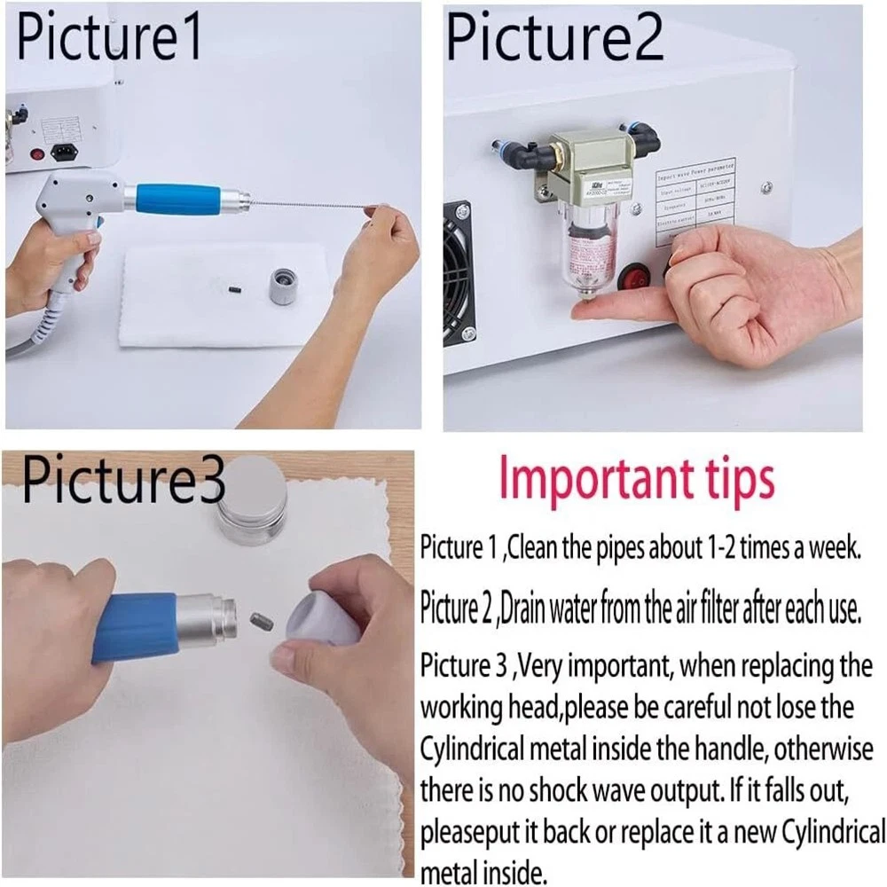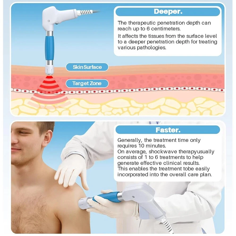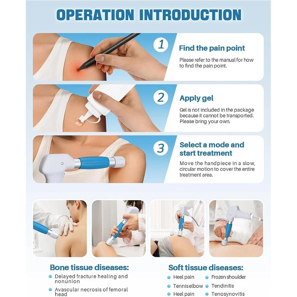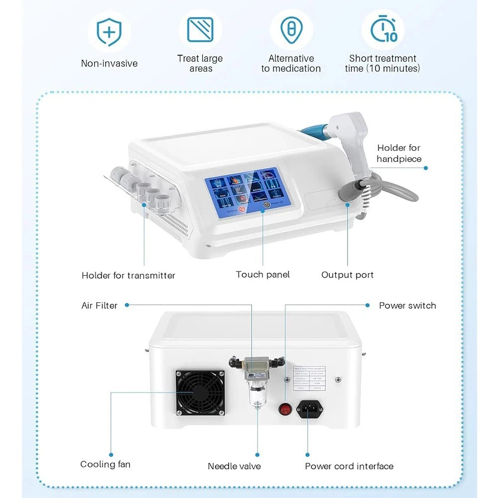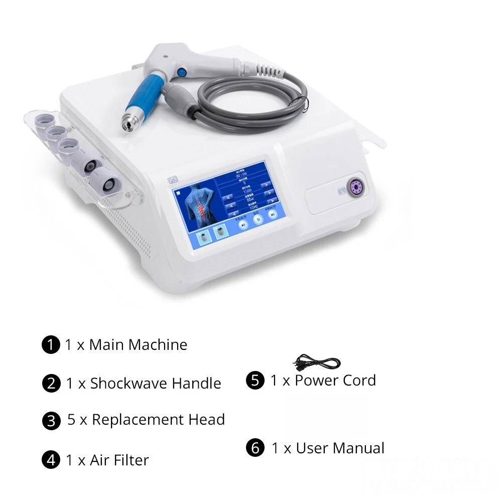 TECHNICAL SPECIFICATIONS Voltage: 110V Power: 350 W Max. Current: 5 A Max. Operating Frequency: 1 - 22 Hz Working Intensity: 0.5 - 8.0 bar Product Size: 15.9 in. x 14.2 in. x 6.3 in. (40.5 cm x 36 cm x 16 cm) Package Size: 18.1 in. x 17.3 in. x 12.4 in. (46 cm x 44 cm x 31.5 cm) Net Weight: 30.8 lb. (14 kg) Gross Weight: 32.0 lb. (14.5 kg) IN THE BOX 1 x Main Machine | 1 x Shockwave Handle | 5 x Working Head | 1 x Air Filter | 1 x Power Cord | 3 x Bullets | 2 x Shockwave Holder | 1 x User Manual TECHNICAL SPECIFICATIONS Voltage: 110V Power: 350 W Max. Current: 5 A Max. Operating Frequency: 1 - 22 Hz Working Intensity: 0.5 - 8.0 bar Product Size: 15.9 in. x 14.2 in. x 6.3 in. (40.5 cm x 36 cm x 16 cm) Package Size: 18.1 in. x 17.3 in. x 12.4 in. (46 cm x 44 cm x 31.5 cm) Net Weight: 30.8 lb. (14 kg) Gross Weight: 32.0 lb. (14.5 kg) PRODUCT FEATURES Customizable Treatment with Precision Targeting Experience tailored pain relief with five interchangeable heads, allowing you to target specific body areas for more precise muscle relaxation and fatigue alleviation. Personalized Intensity for Your Comfort Adjust the working frequency from 1 Hz to 22 Hz and intensity from 1 Pa to 8 Pa, customizing the treatment to suit your unique needs. Easy Operation with Intelligent Touch Screen Enjoy effortless control with a user-friendly touch screen offering 12 operating modes, simplifying your operation and treatment. Safe and Non-Invasive Solution Opt for a non-invasive treatment option that minimizes risks and side effects, providing a safer, more natural way to relieve pain, relax muscles, alleviate fatigue, etc. Accessible for a Global Audience Choose from 10 languages on the interface, ensuring ease of use for users worldwide, including options like English, Spanish, and Korean. IN THE BOX 1 x Main Machine | 1 x Shockwave Handle | 5 x Working Head | 1 x Air Filter | 1 x Power Cord | 3 x Bullets | 2 x Shockwave Holder | 1 x User Manual On Apr 7, 2026 at 23:51:26 PDT, seller added the following information: