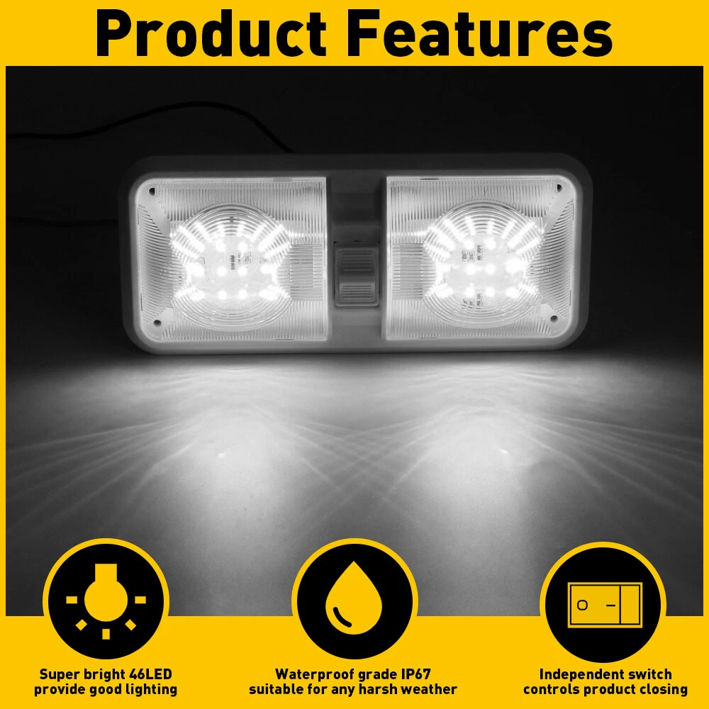 Specification: Material:PC LED: 48 LEDs(left+right) LED type:2835 SMD LED Voltage:11-18V Color temperature:4000-4500K Lumen:600LM Waterproof IP: IP67 Service life:50000h+ Features: *High-brightness and Comfortable Light Source The LED lighting lamp with three gears switch to control has built-in 48 high-quality LED chips, you can easily perform indoor work at night. *Simple installation Easy installation, Low power consumption. *IP67 waterproof Prevent from water, snow, moisture, rusting and dust, don't worry about leak inside problem. *Gears Control NEW RV 48 LED 12V CEILING FIXTURE DOUBLE DOME LIGHT FOR CAMPER TRAILER RV MARINE Specification: Material:PC LED: 48 LEDs(left+right) LED type:2835 SMD LED Voltage:11-18V Color temperature:4000-4500K Lumen:600LM Waterproof IP: IP67 Service life:50000h+ Features: *High-brightness and Comfortable Light Source The LED lighting lamp with three gears switch to control has built-in 48 high-quality LED chips, you can easily perform indoor work at night. *Simple installation Easy installation, Low power consumption. *IP67 waterproof Prevent from water, snow, moisture, rusting and dust, don't worry about leak inside problem. *Gears Control Independent switch control can make it easy to open and close at any time. Gears description: Built in 3-way switch (to use one or both sides of light fixture) Gear 1:One side on Gear 2:light off Gear 3:Two sides on *Application It is widely used as perfect replacement light for Car/RV/Trailer/Camper/Motorhomes/Marine Boats.. Packaging include: Dome light *1 Item Specifics Features CAN bus Compatible Bulb Fitment Code C5W Manufacturer Warranty 2 Year Quantity 1 Custom Bundle Yes OE/OEM Part Number / Lighting Technology LED Suitable For Dome Light Material PC LEDS 48 Light Color Cold White Number of Bulbs 1 Life 50000 h Led Type 2835 SMD LED Waterproof IP67 Manufacturer Part Number LLK-DRCTH-W5 Volt 11-18V Brand Unbranded Part Type Accessories Type Light Bulb FAQ ♥ If you have a decoding problem or any other problems, please contact us first, we will help you with it. We will reply you within 24 hours in working days. I'm a new seller, thanks a lot for your trust and convince! I will serve you with all my heart. ♥ Q1: Will this bulb fit my vehicle? A: We can match almost any vehicle to one of our bulb sizes. eBay only lets us include some vehicle fitments per listing, but if your vehicle does not show up on the compatibility table at the top of our listings, welcome you to contact us for free consulation before purchasing a product. Q2: My item has not arrived, what's taking so long? A: Sometimes items take longer than expected, especially if it’s going far or to rural area. Check with your post office to see if your item has been held up. Sometimes Royal Mail will not update a tracking number until it has arrived at its destination. If your item still don't arrive after a few days, let us know so we can double check for you and help solve it asap. Q3: My bulbs won't fit, help! A: Special bulb holder may be required. See if you can take the holder from the stock bulb. If not, let us know. The bulb size may be wrong, double check the item you received with the item you ordered. Do you have an aftermarket lighting housing? These may not be perfectly fitted for aftermarket bulbs and will require some manual modifications. Q4: Neither side lighting up? Both sides flicker, hyper flash, or work inconsistantly. A:Check the light fuses, and then check the ballast plugs to insure correct installation. If this doesn't work, there may be a voltage problem with the vehicle. You probably just need a relay or capacitor. Even though some bulbs are builtin resistors, they may still need a decoder. Pay & Ship (1). We gladly accepts payment via PayPal, We will ship your item(s) within 24 hours. (2). Before payment, please keep the consistency of Paypal address and ebay address. (3). Quantity orders are welcome! Returns (1). We offer 60 days free return policy. Please contact us within 60 days from the date you receive your order if you have any issues with the product or want return. Refund will be send after we got your resend package. (2). All returned items should be in the original packaging , return tracking information should be provided . Contact Us (1).Negative feedback will not help resolve any problems you have, please contact us via eBay messages before leaving negative feedback , our customer service will make best effort to help you with the issues. (2).We maintain high standards of excellenceand strive for 100% customer satisfaction! Feedback is very important to us. We request that you contact us immediately before you give us neutral or negative feedback, so that we can satisfactorily address your concerns. About us We're professional in car and motorcycle accessories, especially in LED bulbs. We have our own factory and R&D team. Our belief is to sell top quality items that fit your car and serve you with our heart. Anything please feel free to contact us! Our customer service is very responsibility. Come and follow us! DESCRIPTION NEW ARRIVED HOT SALE CONTACT US SAVE US Store Category Store Home Other Hot Item LED License Plate Tag Lights For 2014-18 Chevy Silverado GMC Sierra 6000K White USD 14.89 LED License Plate Light For 88-00 Chevy C/K 1500 2500 3500 BRIGHT WHITE Tag Lamp USD 13.99 1000pcs Headliner Star Light kit Roof Twinkle Ceiling Light Optic Fiber Home Car USD 72.99 RGB LED Car Neon Light Chassis Atmosphere Lamp Kit For Honda Nissan Subaru Audi USD 31.34 5Pcs FORD F350 F150 For F250 Roof Top 1973-1997 Cab Lights Marker Amber Lights USD 27.54 New List Item Headlights Chrome Housing Headlamps For Toyota 4Runner 2003 04 2005 Left Right D USD 101.99 Right Rear Bumper Reflector Light Tail Lamp For 2007-2009 Honda CRV Passenger USD 10.99 AUXITO 9005 9006 LED Headlight Kit Combo Bulb High Low Beam Super White 6000K X4 USD 47.99 For 2014-2021 Chevy Camaro Malibu Volt Super White LED SMD License Plate Light U