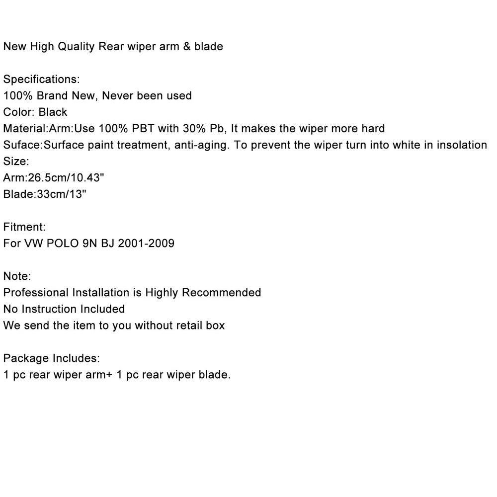 You may also like For Honda CRV 2007 2008 2009 2010 2011 14'' Rear Window Wiper Arm & Blade Set 22.63 USD Free shipping 2* Rear Windshield Wiper Arm & Blade for Toyota 4Runner 2003-2009 85242-35021 #8 23.63 USD Free shipping Rear Window Windshield Wiper Arm Blade Set For VW Tiguan 5N BJ 2007-18 Black .· 20.63 USD Free shipping Rear Window Windshield Wiper Arm Blade Set For VW Tiguan 5N BJ 2007-18 Black 20.63 USD Free shipping Rear Window Wiper Arm Blade For Grand Cherokee 2005 2006 2007 2008 2009 24.63 USD Free shipping Rear Wiper Arm Blade Kit For Dodge Caravan Chrysler Town & Country 2008-2015 .· 21.63 USD Free shipping Car Windscreen Window Rear Wiper Arm Wiper Blade Set for VW Golf 5 MK5 04-08 .· 18.63 USD Free shipping Rear Window Windshield Wiper Arm Blade Set For Renault Clio II 1998-2012 19.63 USD Free shipping Rear Window Wiper Arm & Blade for Magnum 2005 2006 2007 2008 Nitro 20.63 USD Free shipping 68102192AB Rear Window Lift Motor for Jeep Cherokee 2014-2019 65.63 USD Free shipping Windshield Wiper Arm Pivot Adapter Connecting Arm Clip E3TZ-17531-A for Ford 14.88 USD Free shipping Windshield Washer Pump for Nissan Versa Tiida 2007-2013 Juke 2011-15 28920EL00A 17.63 USD Free shipping Windshield Washer Pump for Honda Clarity 2017-2021 76806-TRT-003 17.63 USD Free shipping Washer Windshield Pump 05139113AA for Chrysler 300 Dodge Challenger Charger 15.63 USD Free shipping Windshield Washer Pump for Chevrolet Cruze Camaro 2016-2021 13508971 17.63 USD Free shipping Front Windshield Wiper Motor for Chevrolet Chrysler for Dodge 68030272AA 79.63 USD Free shipping All Models For Honda For Suzuki For Kawasaki For Yamaha For BMW For Polaris For CFmoto For Ducati For Benelli For Trident For Triumph For Aprilia Other part You may also like New Positive Battery Terminal Cable 61129225099 For BMW X3 F25 2011-2013 53.63 USD Free shipping Front Hood Latch Release Handle 68002785AA For Dodge Charger Chrysler 06-10 17.63 USD Free shipping Carbon Side Mirror Cover Caps M Style For BMW X5 F15 X6 F16 28i 35i 15-18 76.63 USD Free shipping For Philips HB3/4 Ultinon Pro9000 LED Headlight Bulbs +250% 5800K 11005U90CWX2 171.63 USD Free shipping 1" Hose w/ 1/8" NPT Steam Port Adapter Top Radiator LS Swap Coolant 13.63 USD Free shipping PRODUCT DESCRIPTION New High Quality Rear wiper arm & blade Specifications: 100% Brand New, Never been used Color: Black Material:Arm:Use 100% PBT with 30% Pb, It makes the wiper more hard Suface:Surface paint treatment, anti-aging. To prevent the wiper turn into white in insolation Size: Arm:26.5cm/10.43" Blade:33cm/13" Fitment: For VW POLO 9N BJ 2001-2009 Note: Professional Installation is Highly Recommended No Instruction Included We send the item to you without retail box Package Includes: 1 pc rear wiper arm+ 1 pc rear wiper blade. About Us Payment Shipping Returns Contact Us About VIPIH VIPIH is one of the international leading distributors specialized in distribution of motor parts of the world's prime motorcycle part suppliers on a global scale with the full responsibility in procurement, shipping, sales and marketing and after sales service. VIPIH fulfills all needs of its clients completely and on a timely basis with the know-how it has built up since it was established and the comprehension knowledge of the sectors standards. The perfectionist approach in product quality, high service availability, strict principle of business follow-up, reliability and the good reputation which has gained strength as a result of customer satisfaction are the most striking components of VIPIH's success. VIPIH is presently capable of supplying all demands for motor parts from the petrol pump to rectifier in a wide range. Free delivery with worldwide shipping options available. If you need any further information before ordering,please get in touch with expert advice. About Item All items sold by us are being described to the best of our abilities, as accurate as possible, and with utmost conscientiousness on our part. However, to avoid any potential oversights, I respectfully request your assistance in helping us to make this a mutually satisfactory transaction by THOROUGHLY reviewing item description and photos, and asking all questions PRIOR TO BIDDING. Customer Satisfactory 1.We back our commitment with superb service, 100% full money back and a customer satisfaction guarantee. 2.I am here and ready to assist you with any questions or concerns you might have before or after the purchase. 3.My goal is to make sure you are a happy customer and pleasant shopping with us. Feedback If you are satisfied with the purchase and our total service, your comment is very important in our business success. Please take a minute to leave us a positive feedback with an overall Detailed Selling Rating (DSR) of 5. Our eBay account setup auto feedback, so eBay system gives you automatically Positive feedback back after your positive feedback left. If you plan to give us a neutral/negative feedback Or open ebay/paypal case, please write to us immediately so that we can do our best to resolve your problem. 1.We only accept PayPal. 2.PayPal is the only online payment method we accept. Please make sure you have a valid/confirmed PayPal account prior bidding. 3.Payment must be made within 3 days of the auction end time. Non-Paying bidders will be reported. 4.Our eBay account automatically open a dispute for a unpaid item, when we don't receive your payment after 4 days. United States Buyers Parcel will via USPS or UPS from us United States warehouse Shipping Time Usually ,Parcel will be delivered 2-10 working day include Handling time. Sometimes shiping time may has a little delay, such as Bad wether,Holidays We stand behind everything that we sell and will do everything possible to assure you are satisfied. When you receive your purchase if you are not 100% satisfied, please sent me ebay message and we will do our best to make you happy. If you still want to return your purchase, simply ship the it