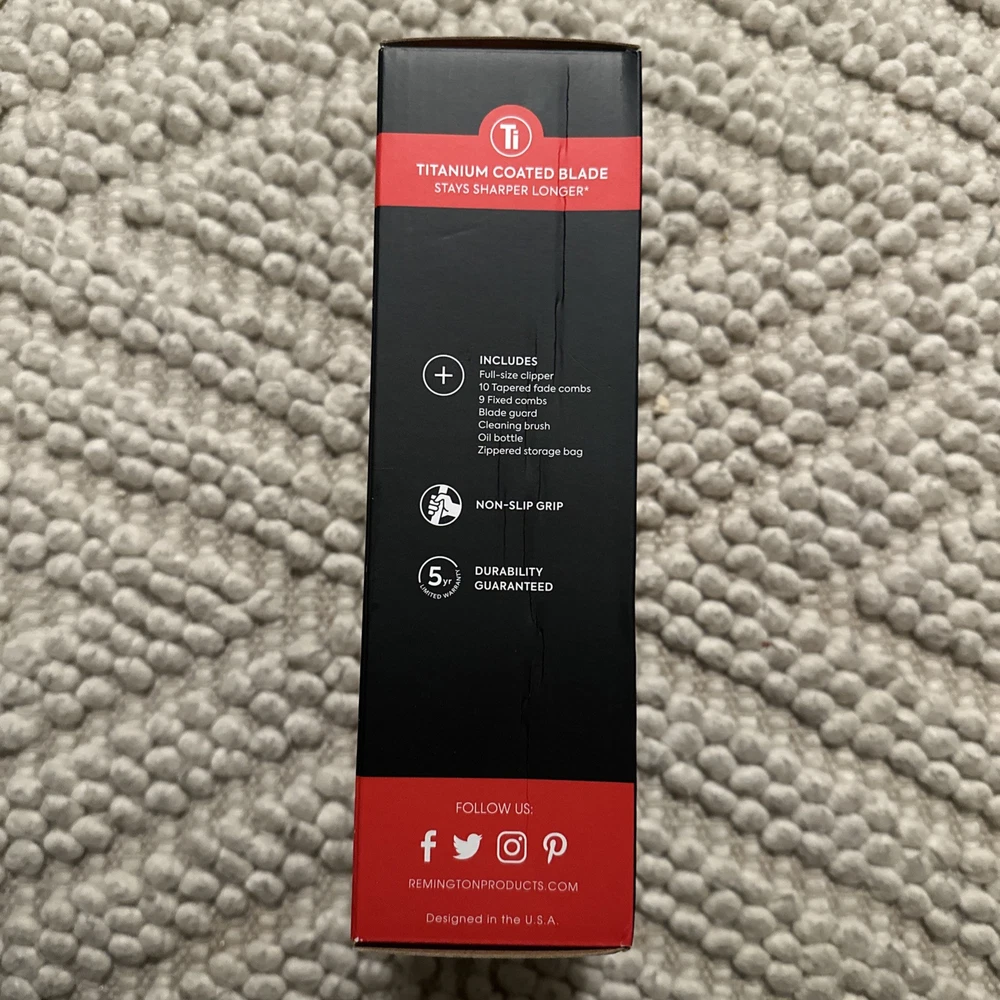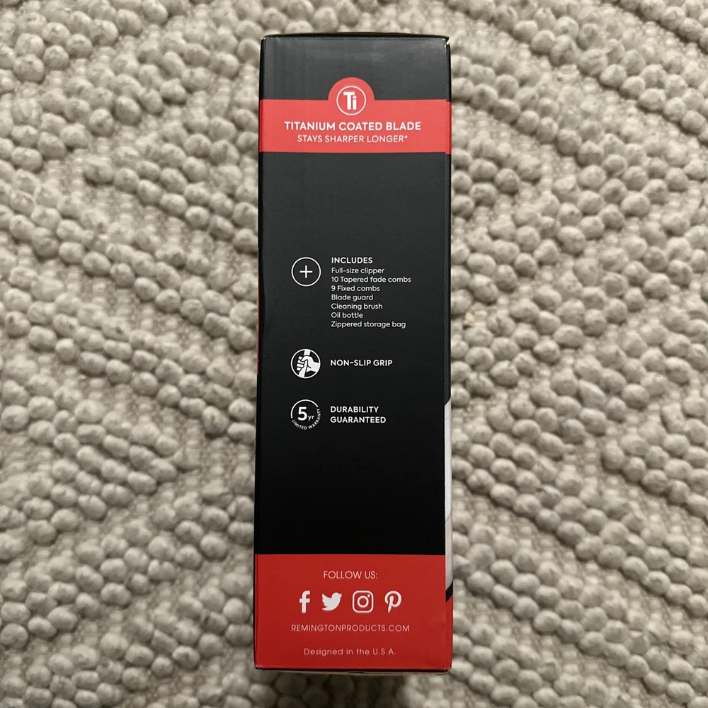 UPC: 074590557312 Features: Rechargeable Cutting Lengths: 0.9 mm Head Type: Body Trimmer Brand: Remington Type: Haircutting Kit gtin13: 074590557312 Power Source: Battery Model: D.I.Y Fade Department: Men Body Area: Body, Face MPN: Na Number of Heads: 1 Color: Black