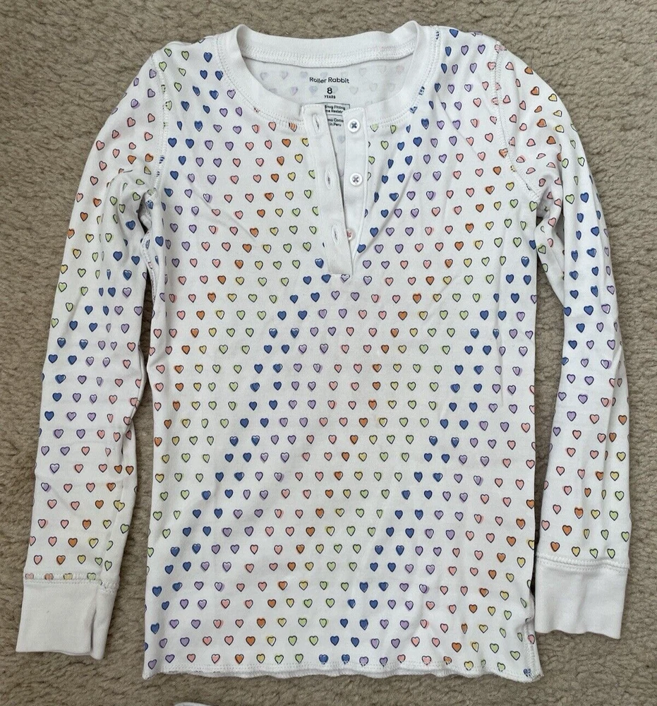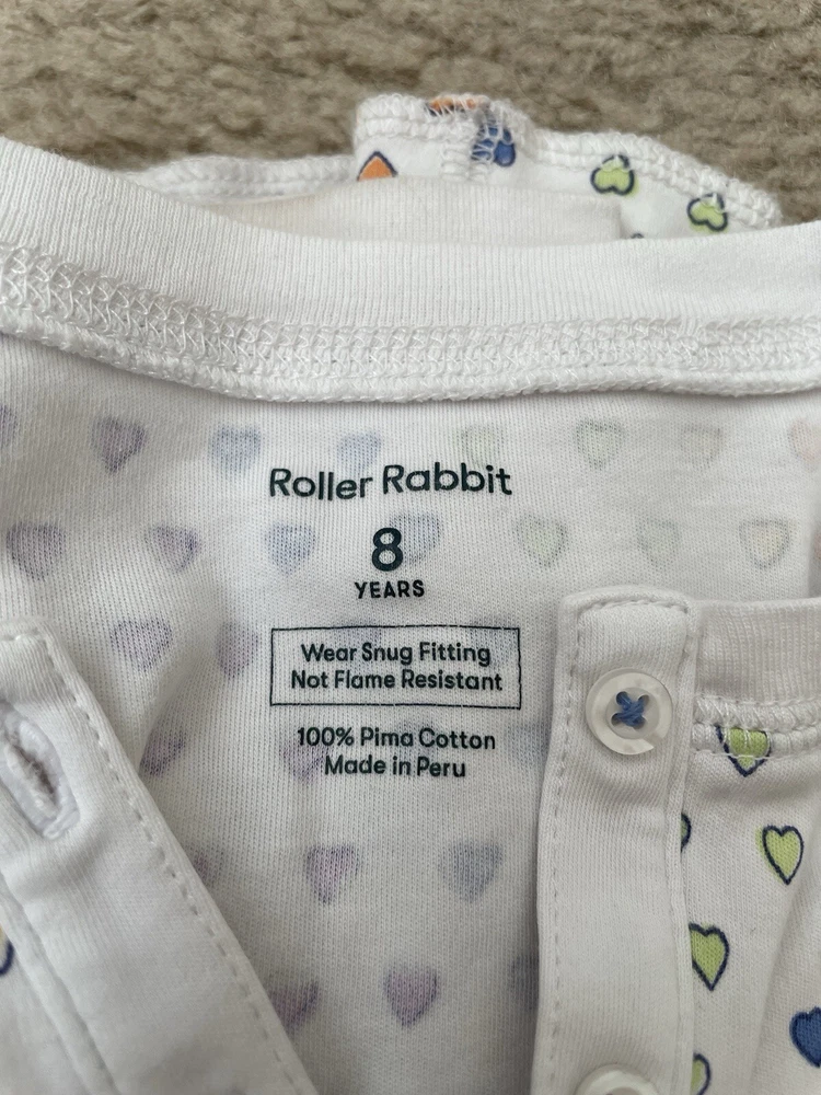 New without tags Roller Rabbit pajama set, rainbow hearts pattern size 8.Only issue is there is a small faint brown stain on the bottom backside of the top, <1/4 inch in size.If you have any questions please feel free to contact me.Thank you for looking and have a great blessed day.