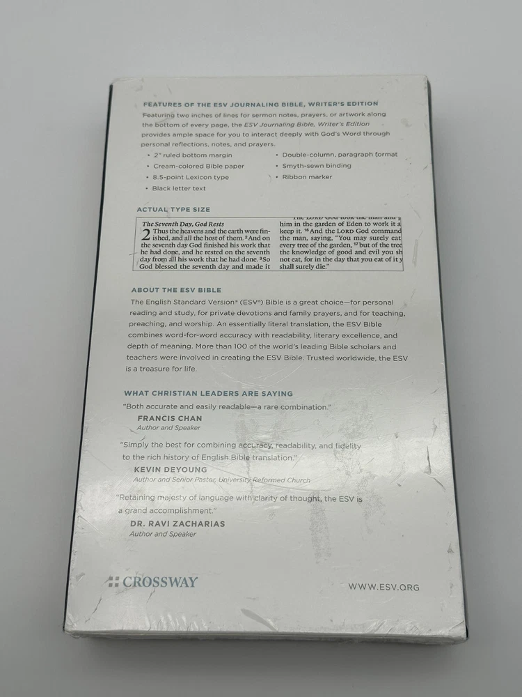 Enhance your Bible study with this ESV Journaling Bible, Writer’s Edition by Crossway, perfect for personal reflection, sermon notes, and creative journaling. Featuring a durable Smyth-sewn hardcover binding, cream-colored paper, and ample space for notes in ruled margins, this Bible is designed to last and be cherished. With its sealed, pristine condition, this edition makes a wonderful gift or collector’s item for any Christian enthusiast. Don't miss the opportunity to add this versatile Bible to your collection or daily devotions. The book is in brand new, sealed condition with its original plastic wrapping intact. The outer box shows some light signs of shelf wear with minor scuffing on the surface and edges. The Bible itself is untouched and in pristine condition, ideal for collectors or those seeking a high-quality journaling Bible.