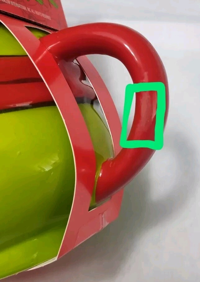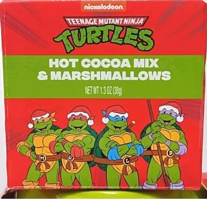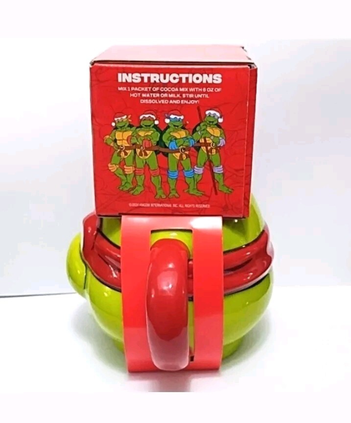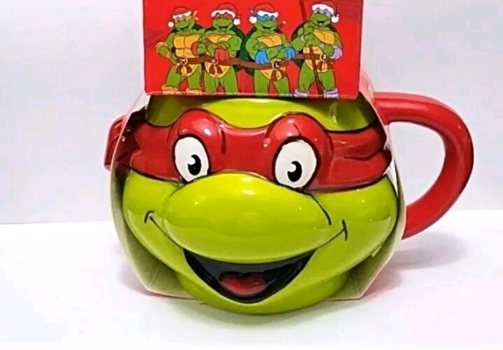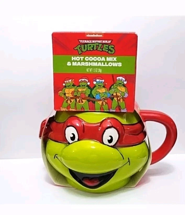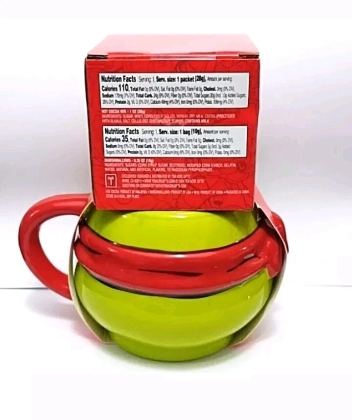 The product is a Nickelodeon Teenage Mutant Ninja Turtles mug featuring the character Raphael. This ceramic mug is designed with a colorful pattern and is perfect for enjoying hot beverages like hot cocoa. It comes sealed with a hot cocoa mix, making it a fun and practical collectible item for fans of the popular cartoon franchise. The mug is suitable for all occasions and would make a great addition to any kitchen or home decor collection. The handle is unpainted due to handling of the article, the unpainted area is outlined. make me an offer New sealed !!!