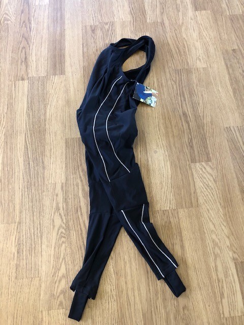 New with tags SMS Santini brand unitard for cycling with a padded seat for comfort Black with smart white piping trim on the legs Size 40 Euro (made in Italy) or US size XS for adults Appears to be unisex Features include stirrups and a little extra padding in the knee area Blend of nylon and elastic Lightweight and very soft SMOKE FREE HOME Bidding starts at $24.99 Winner pays $9.99 shipping