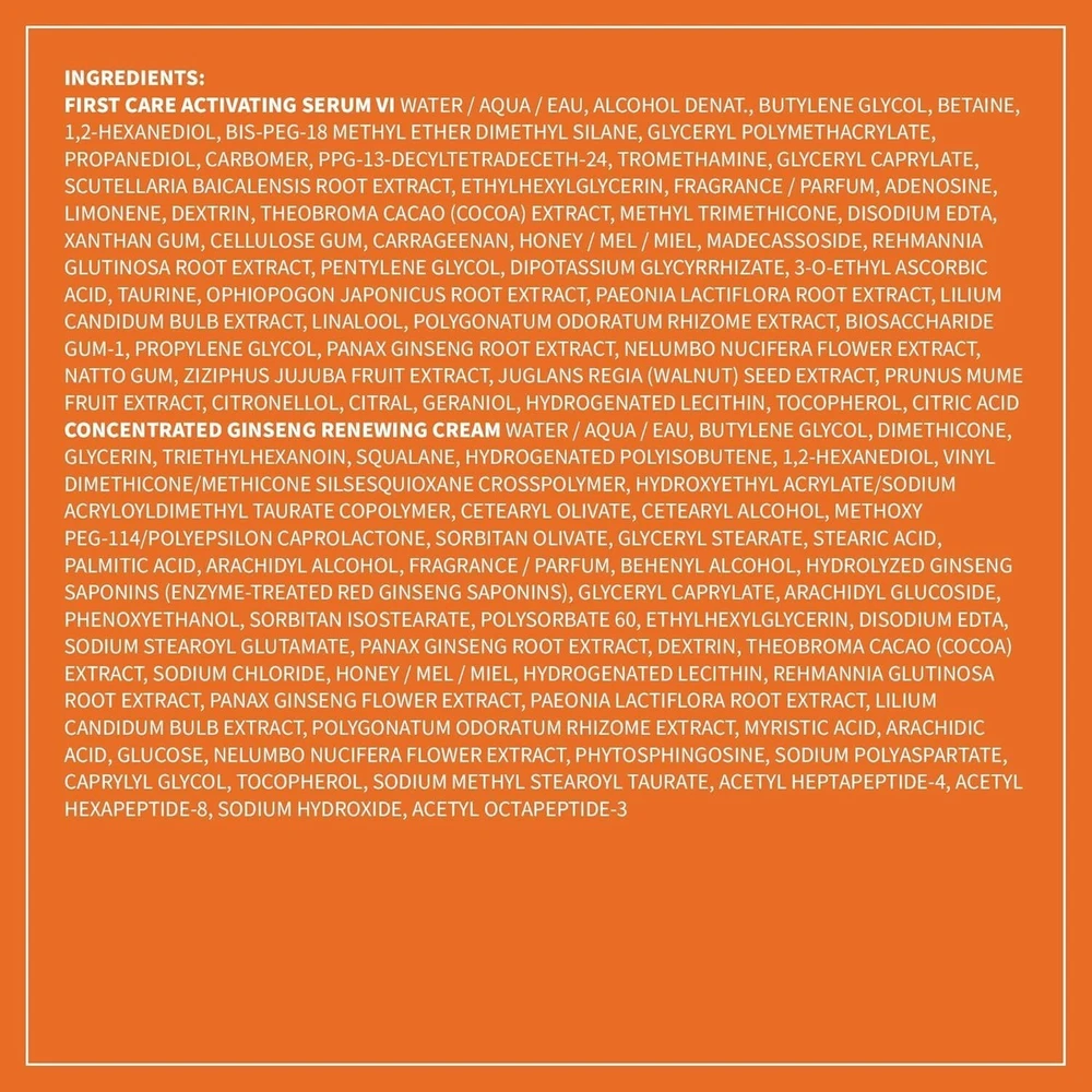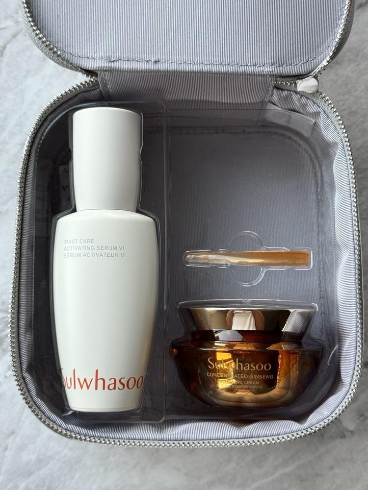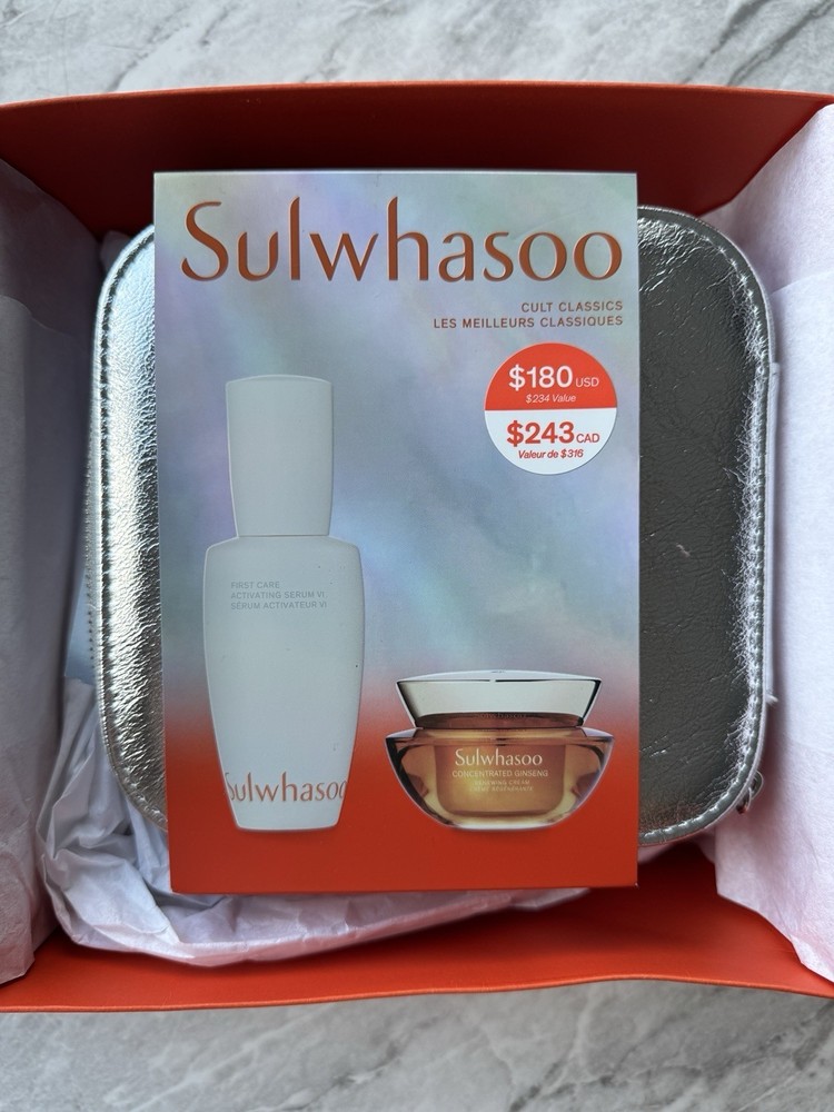 NEW SULWHASOO Holiday Cult Classics Ginseng Serum And Cream Gift Set Korean This set helps boost moisture and visibly improves firmness, sagging skin, and fine lines and wrinkles. First Care Activating Serum VI 2.02 FL. OZ. / 60ML A first of its kind activating serum designed to fortify your moisture barrier post- cleanse to aid in better absorption of products that follow. Immediately after use, it helps improve skin’s water and oil balance while providing lasting hydration. Within four weeks, this serum helps address 10 signs of visible aging.* *Based on an 8-week clinical study on 30 women 39 to 60 Concentrated Ginseng Renewing Cream 1.01 FL. OZ. / 30 ML Description Skin Type: Combination, Dry, Normal, Oily Skin Concerns: Ageing, Dryness, Fine Lines & Wrinkles, Firmness & Elasticity, Uneven Skin Texture Formulation: Cream Skincare By Age: 20s, 30s, 40s, 50+, Under 20 What it is: An anti-ageing cream with soft cream texture that cares for comprehensive signs of ageing for healthier-looking skin. What it does: This powerful anti-ageing cream sustains triple resilience-boosting efficacies of Sulwhasoo's unique GINSENOMICS™ to replenish, support, and help strengthen skin day after day to reveal ageless skin. With a unique texture that feels soft upon application and melts into skin, not only is this cream an anti-ageing masterpiece, but it’s also a sensorial experience. GINSENOMICS™ is a powerful, active beauty Ginsenoside developed by Sulwhasoo to help minimise visible signs of aging. Sulwhasoo enriches the rarest type of Ginseng Saponin more than 6,000 times to produce GINSENOMICS™. It enhances your skin’s ability to regenerate and keep it looking firm and resilient against any external aggressors, helping to reduce wrinkles that have appeared on your skin. Ingredients Product Claims: Anti-oxidants, Oil-free, Paraben-free, Peptides, Sulphate-free, Vitamins
