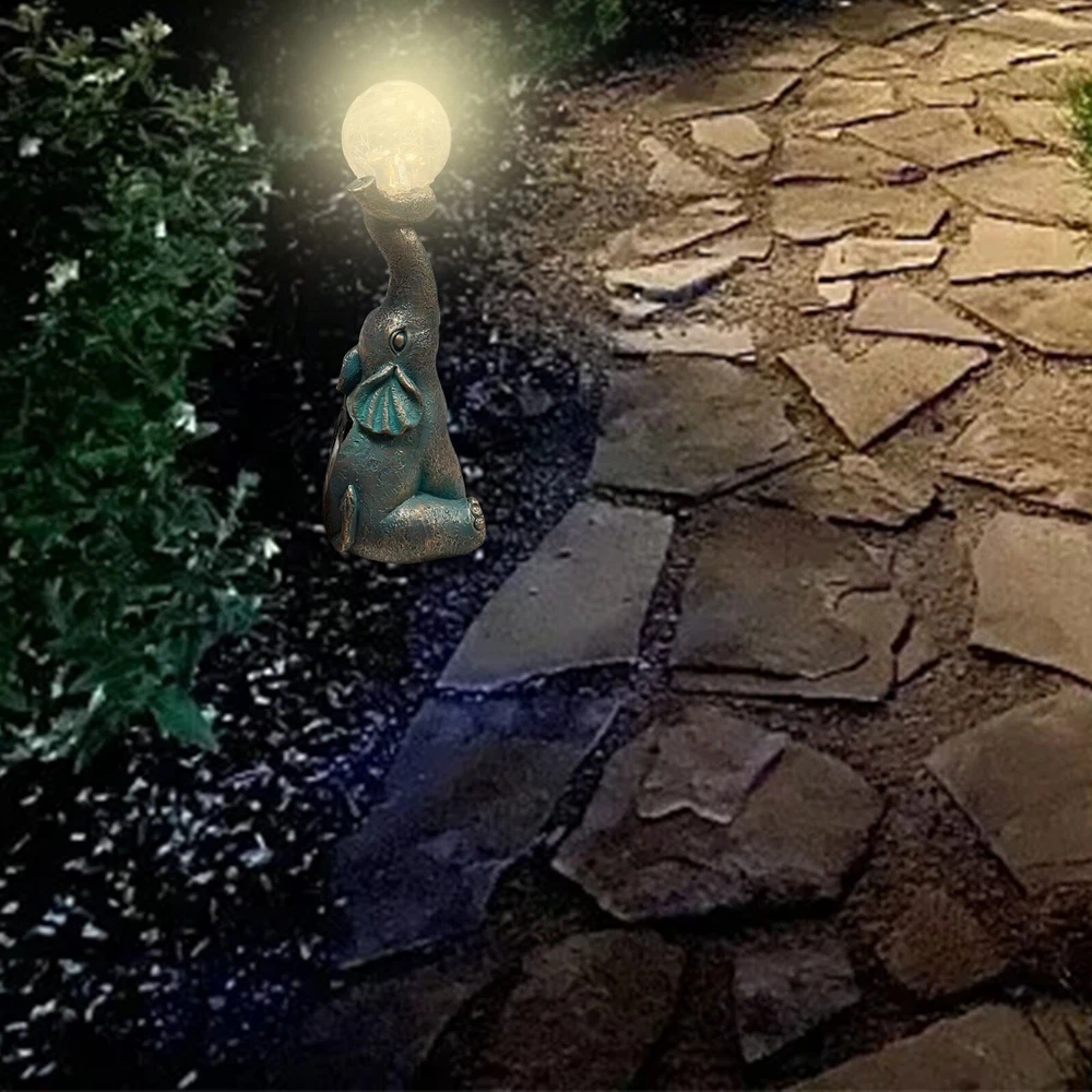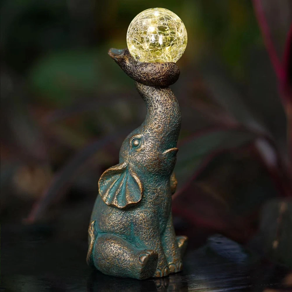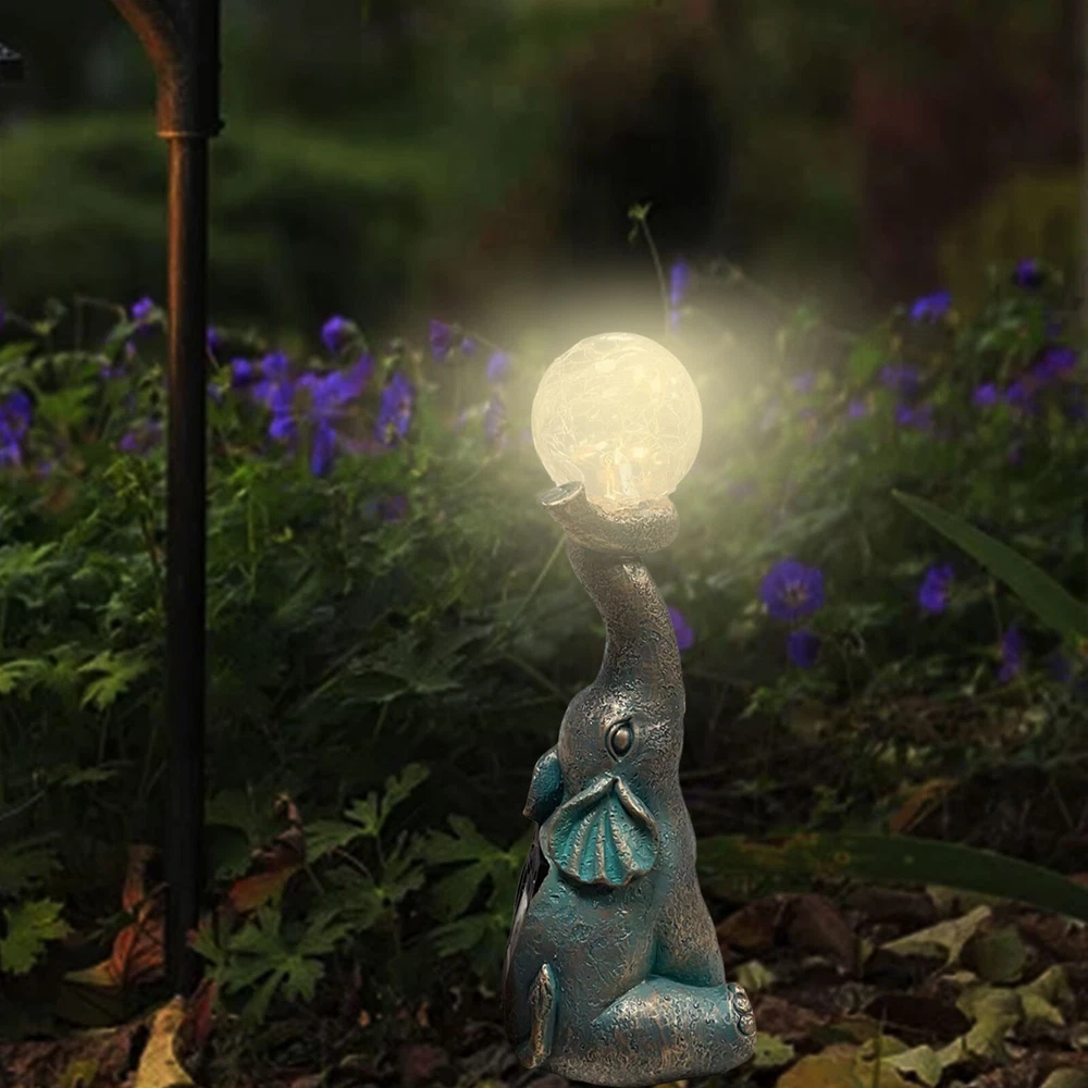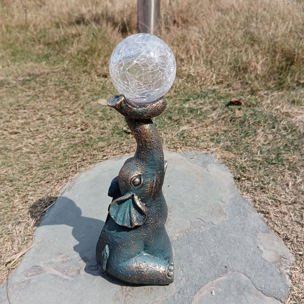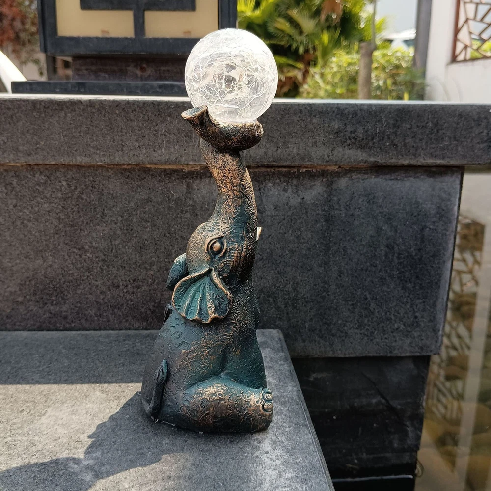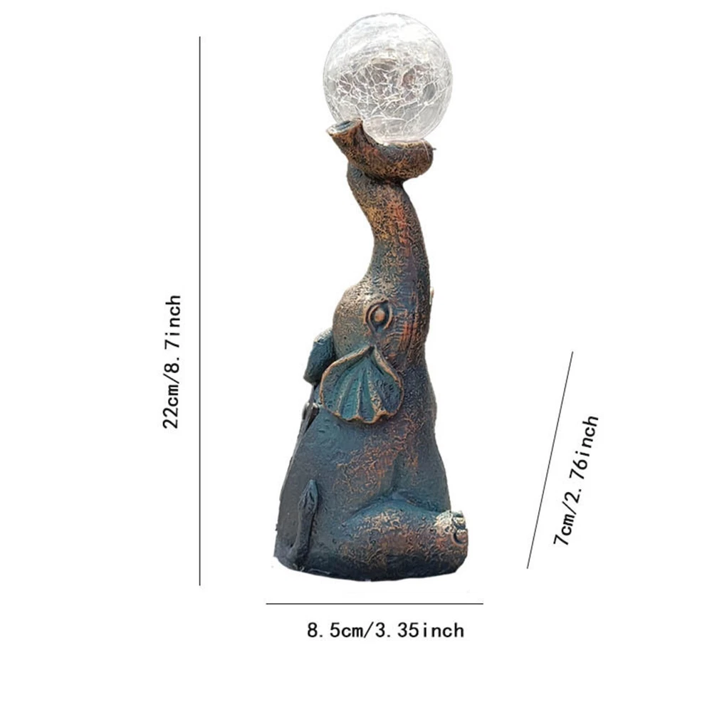 Features: Charming and Eye-Catching : The Garden Decor Outdoor Elephant Statue with Glass Top Solar Figurine is a delightful addition to your outdoor space. Featuring an adorable elephant design and a glass top, it creates a visually appealing ornament that draws immediate attention. Solar-Powered : This figurine includes a built-in solar panel that captures sunlight during the day, powering a soft, enchanting glow at night. The gentle light adds a magical ambiance to your patio or yard, making it a perfect decoration for evening gatherings or moments of relaxation. Durable and Weather-Resistant : Made from high-quality resin, this elephant statue is designed to withstand outdoor conditions. It is resistant to fading, cracking, and chipping, ensuring long-lasting beauty for many seasons. Product size: 8.5 x 7 x 22 cm / 3.35 x 2.76 x 8.66 inches. Versatile Decoration : This charming ornament isn’t just for gardens—it’s ideal for patios, balconies, and yards as well. Its compact size and whimsical design make it a great fit for various outdoor settings, adding a playful and unique touch to your décor. Exceptional Craftsmanship : Each elephant statue is meticulously crafted with attention to detail, showcasing the skill and artistry of the makers. The combination of resin and glass creates a one-of-a-kind piece, bringing personality and character to your outdoor environment. Product Description: Garden Decor Outdoor Statues - Elephant with Glass Top Cute Solar Figurine for Patio, Yard, and Outdoor Art. A perfect addition to any outdoor space, this whimsical elephant ornament features a resin body and glass top, creating a captivating and functional piece. Material : Resin Color : As shown in the picture (Note: Colors may vary slightly due to monitor differences. Please ensure you're okay with this before ordering). Package weight : 302g Package size : 13.5 x 11 x 25 cm (Please allow for 1-3 mm size variation due to manual measurement. Please ensure you are comfortable with this before ordering.)