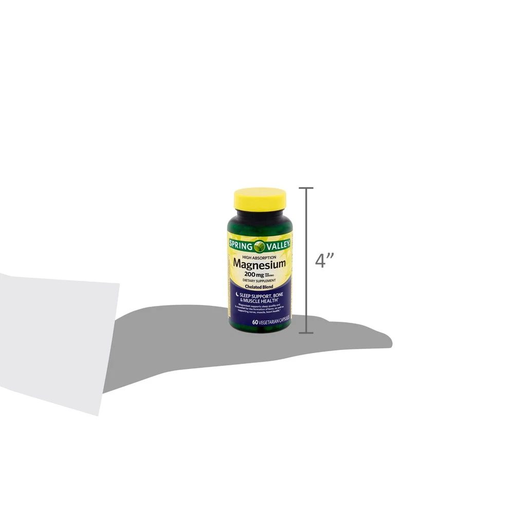 NEW Spring Valley Magnesium Mineral Supplements, 200 mg, 60 Ct Magnesium Sleep Support Bone & Muscle Health Dietary Supplement Vegetarian Capsules, 200 mg 60 Count; capsules are recommended for adult use only Take two 200 mg magnesium capsules per day Essential for the formation of bone Supports nerve, muscle and heart health* are recommended for adult use only Take two 200 mg magnesium capsules per day *These statements have not been evaluated by the Food and Drug Administration. This product is not intended to diagnose, treat, cure, or prevent any disease. Discover more fantastic items by visiting our eBay store! Thank you for choosing to shop with us. We appreciate your support!