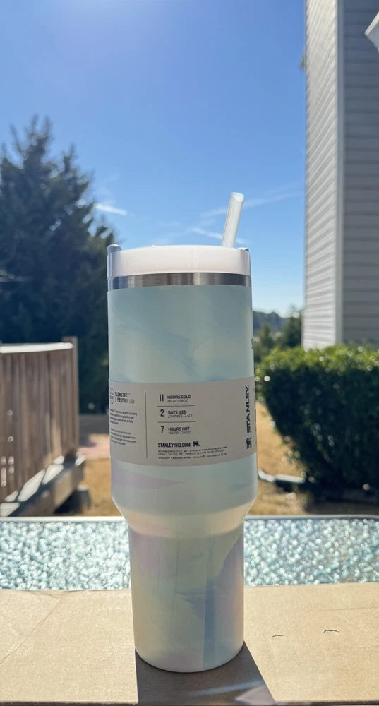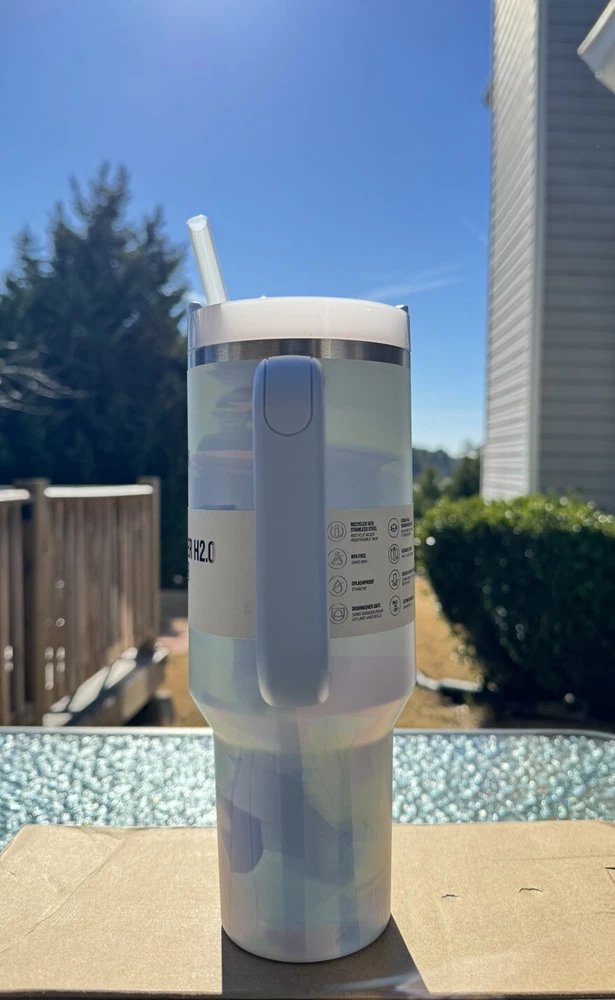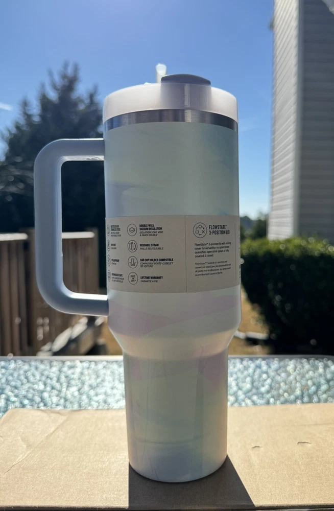 Introducing the NEW Stanley 40oz Quencher Tumbler in the stylish Cool Serene Brushstrokes color. This tumbler is perfect for enjoying hot or cold beverages on the go and can hold up to 40oz of your favorite drink. With its stainless steel material and insulated features, your drink will stay at the perfect temperature for hours. This tumbler also comes equipped with a drink-through lid, straw, and handle for easy and comfortable use. Its sleek design and Clean Slate model make it a perfect addition to any bottle collection. It is ideal for teenagers, boys, adults, and girls alike, making it a versatile unit for any household.