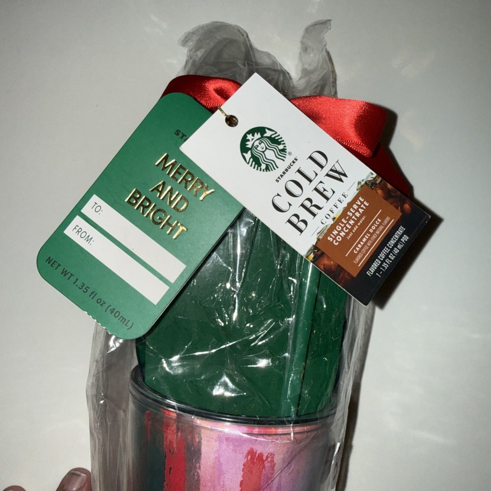 The NEW Starbucks Cold Brew Coffee Tumbler is a 16 oz acrylic cup featuring a multi-color design with the Starbucks brand logo, making it a perfect collectible advertising item for coffee and tea enthusiasts. The tumbler comes with a Caramel Cold Brew Pod, adding an extra touch to the overall coffee experience. This original Starbucks product is a must-have for any coffee lover looking to add a unique and stylish piece to their collection.