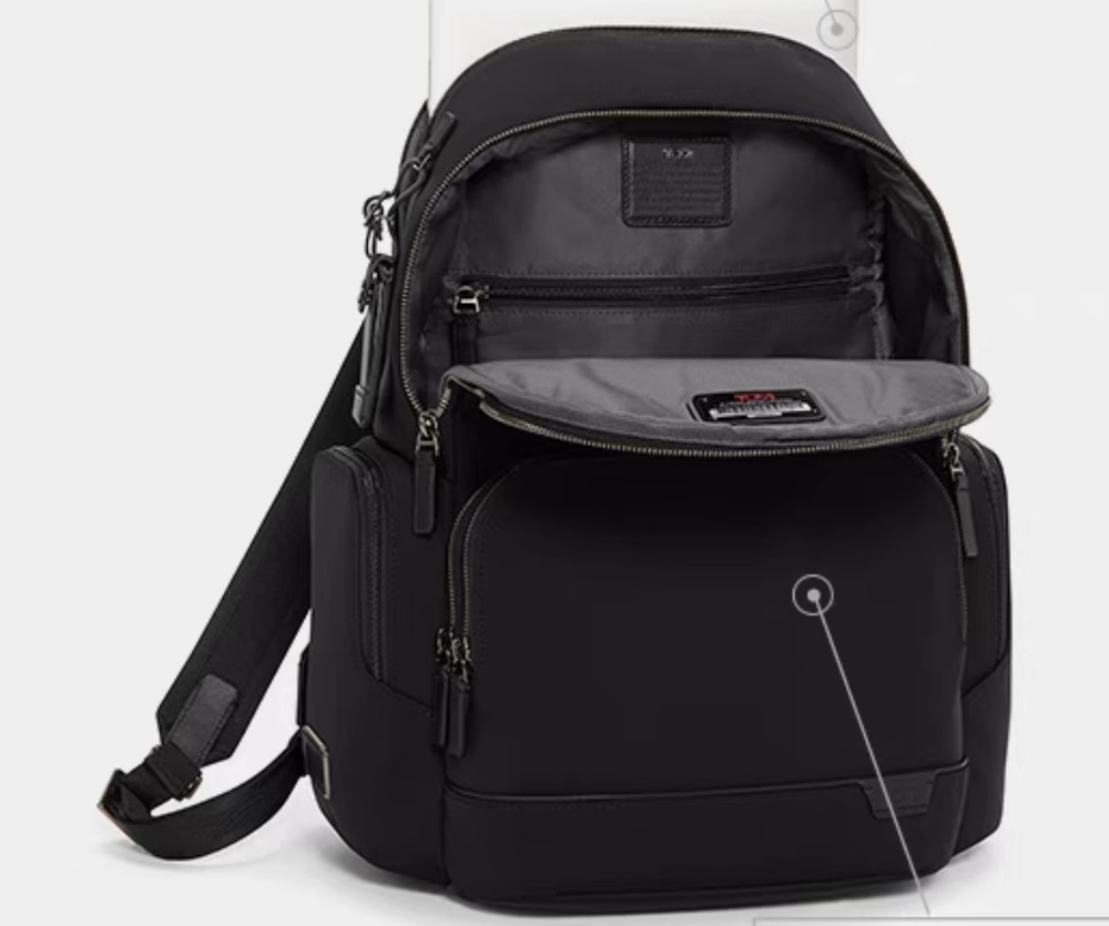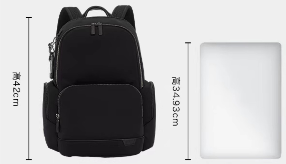 Height X Width X Depth 42 cm X 28 cm X 14 cm Exterior Double zip entry to main compartment Back padded zip to laptop compartment (fits up to a 15" PC or 16" MacBook screen) 2 front zip pockets Front slip pocket Water-resistant side slip pocket Leather top carry handle Quick-access back pocket with hidden magnetic snap closure Quick-access side phone pocket with magnetic snap closure Padded & adjustable backpack straps with leather accents Luggage tag Monogram patch Add-a-Bag strap Interior 5 open pockets 2 zip pockets 2 card pockets 2 pen loops Key leash TUMI Tracer
